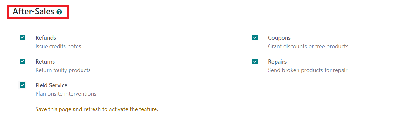 In the After Sales tab, you can activate the Refunds option to issue credit notes for customers, Returns option to return faulty products, Field Service option to plan onsite interventions, Coupons to grant discounts or free products, and Repairs to send broken products for repair respectively. Once you complete all fields, your new helpdesk team is ready to use.