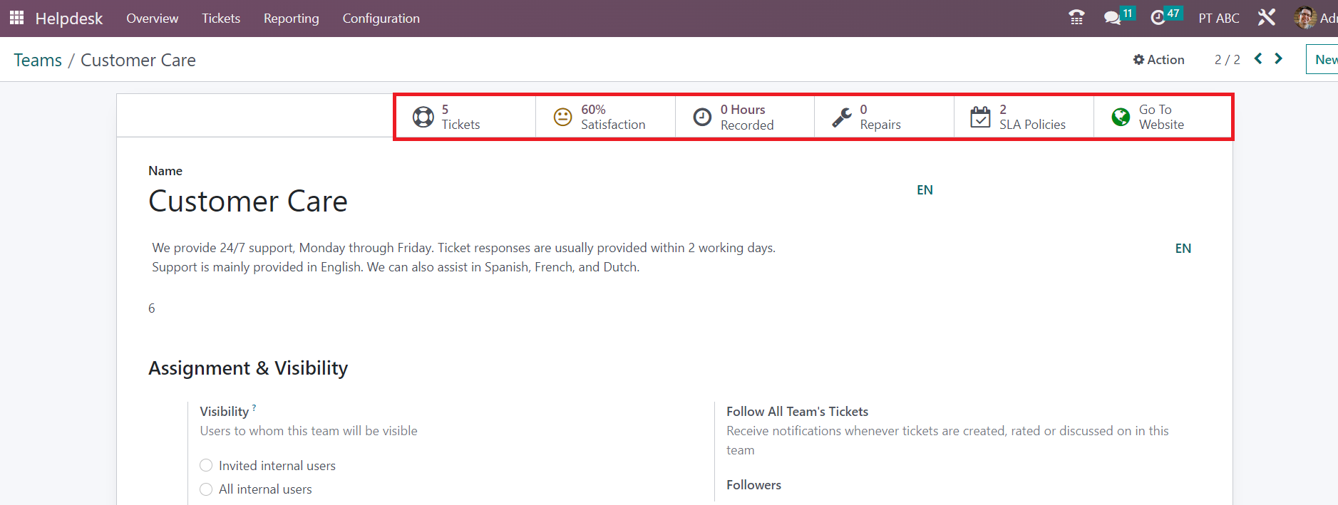 As you can see in the screenshot above, the user will get some smart buttons on the form view to manage the operations related to the helpdesk team in a single place. The Tickets button will show the list of tickets assigned to this particular helpdesk team. The customer satisfaction rating for this team can be seen in the Satisfaction smart button. The total working hours recorded for this helpdesk team is shown in the Recorded button. The Repairs button can be used to manage the repair orders created from the tickets of this team. The SLA Policies associated with this will be available in the respective smart button. Using the Go To Website button, you can go to the website view of this team.