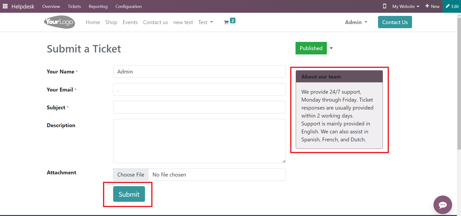 This is the customer preview of the helpdesk contact page. Here, you can view the description that you created for your team on the right side of the screen. The customer can submit a ticket using this form. They can mention their issue in this form and click on the Submit button. When the customer clicks on the Submit button, a new ticket will be created in the Helpdesk module and automatically assigned to the respective team.