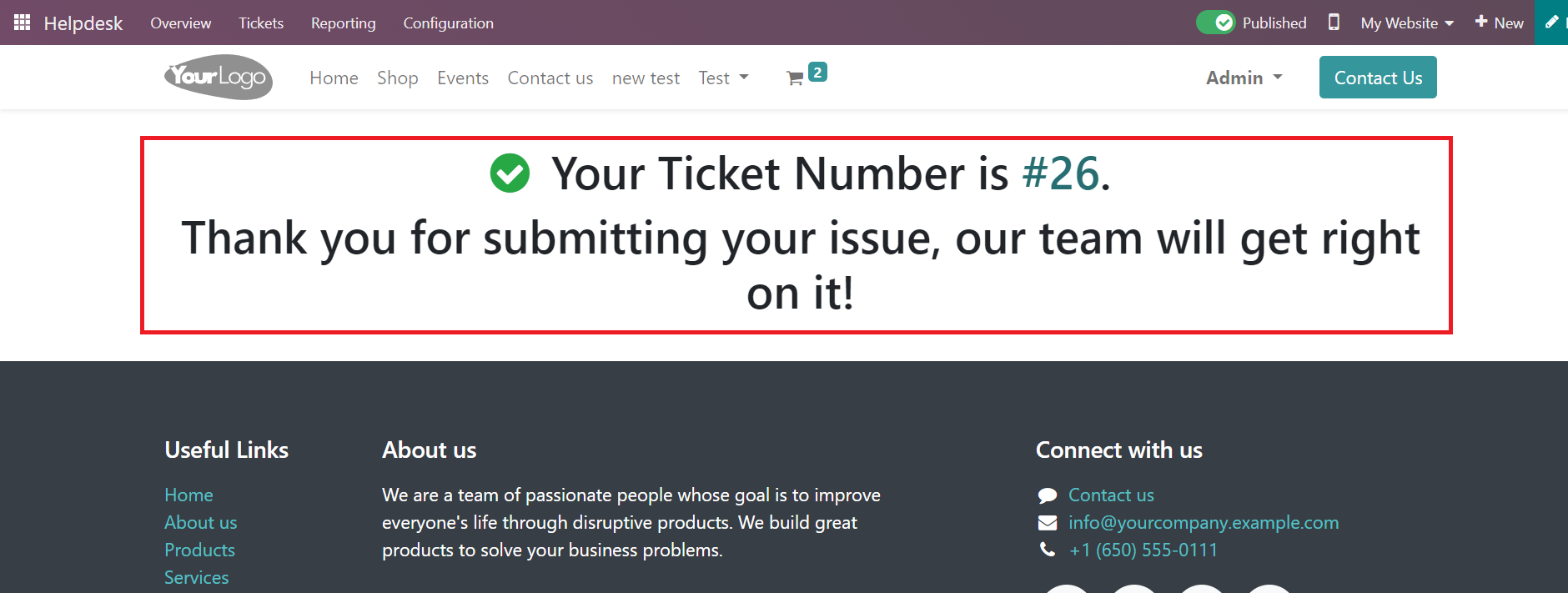 The customer will get the ticket number and a message from the team, as shown in the screenshot above. Now, the assigned helpdesk team can work on this ticket and solve the issue as soon as possible. The operations related to this ticket can be managed in the Tickets menu available in the Helpdesk module.