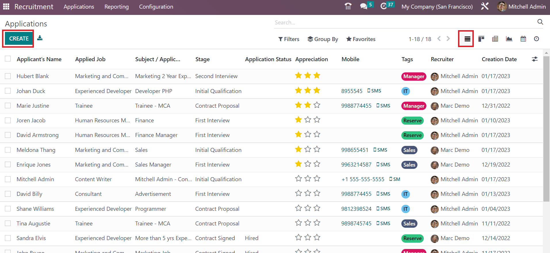 A form consisting of candidate details applied to a job in an organization is a job application. Each company receives various job applications once posting a job position through a website or any other platform. Odoo 16 ensures you access information about each job applicant separately. You can attain a list of all applications once clicking on the All Applications menu in the Applications tab. The List view of the applications window gives an idea about each application data such as Applicants Name, Stage, Tags, Recruiter, Applied Job, Subject, etc. You can choose the CREATE icon if you need to formulate a new application.
