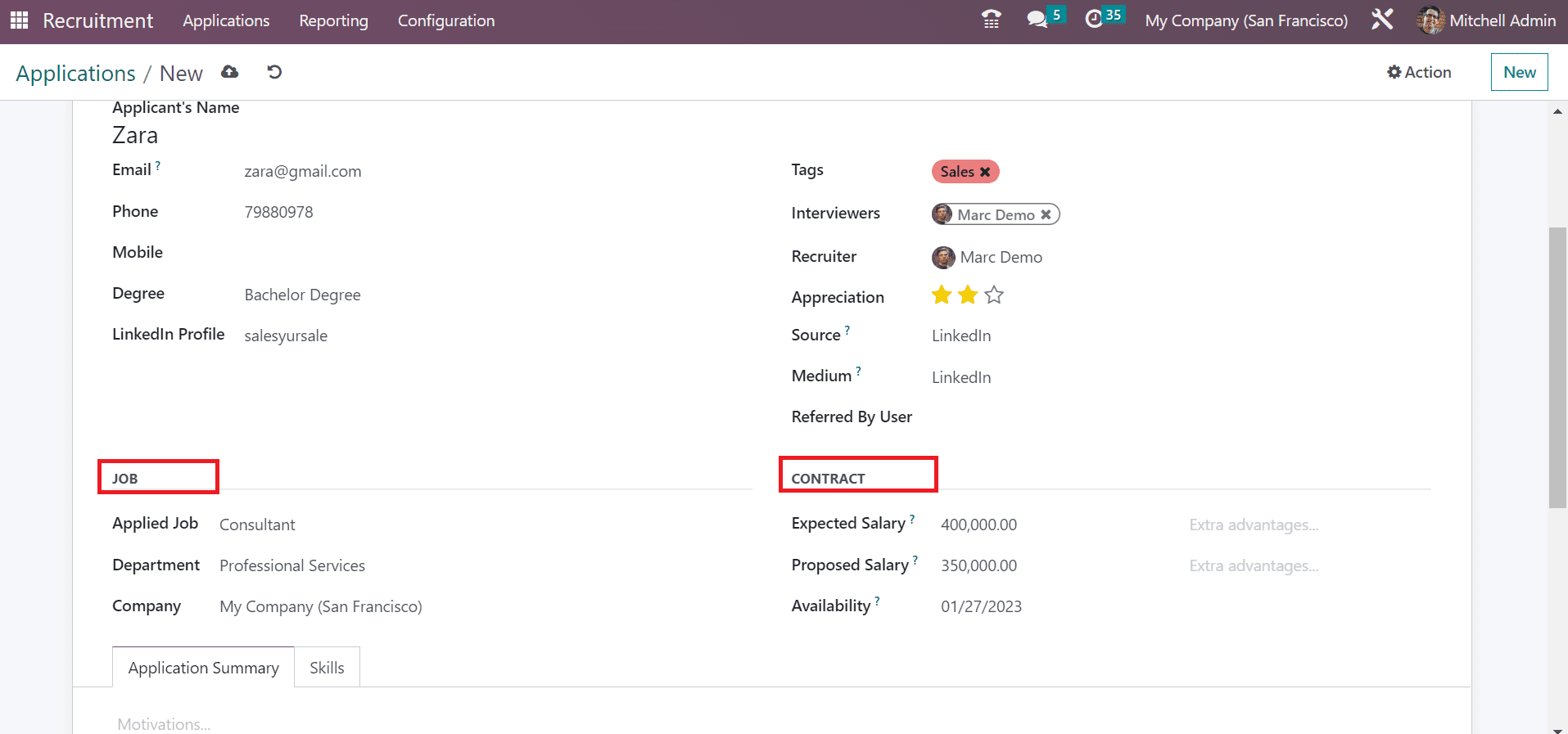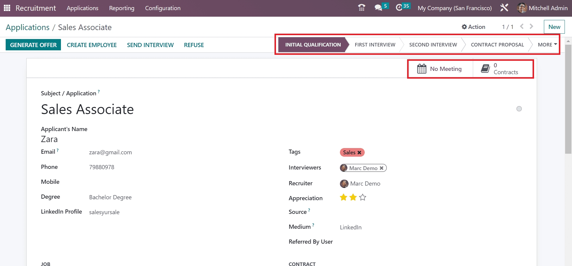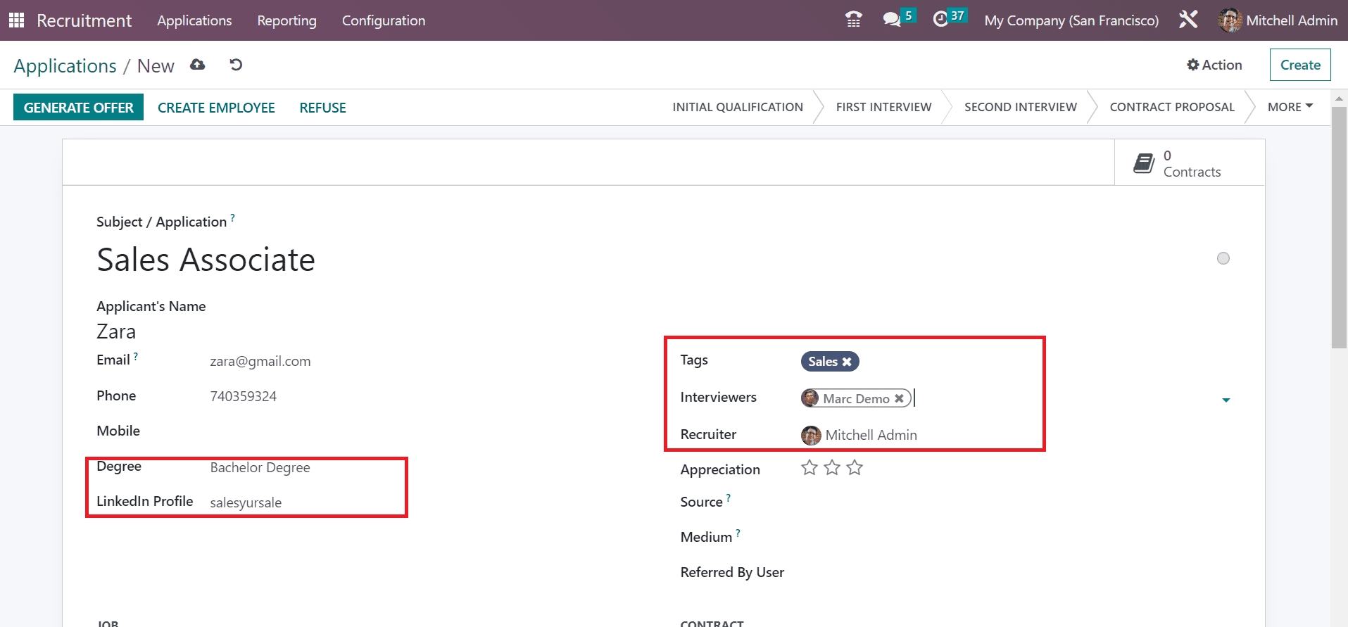 Below the Job section, you can select the job applied by the candidate and the job department. Later, choose your firm name from the Company option. Inside the Contract section, the user can mention the salary expected by the applicant in the Expected Salary field and given by the employer in the Proposed Salary option.