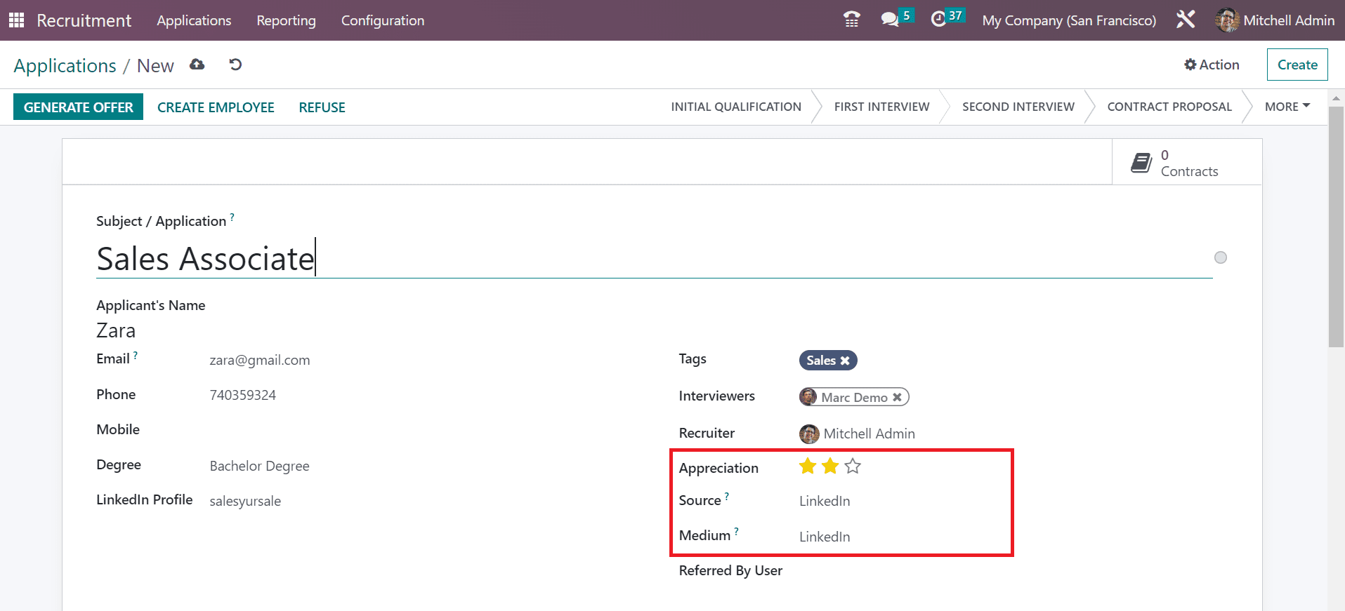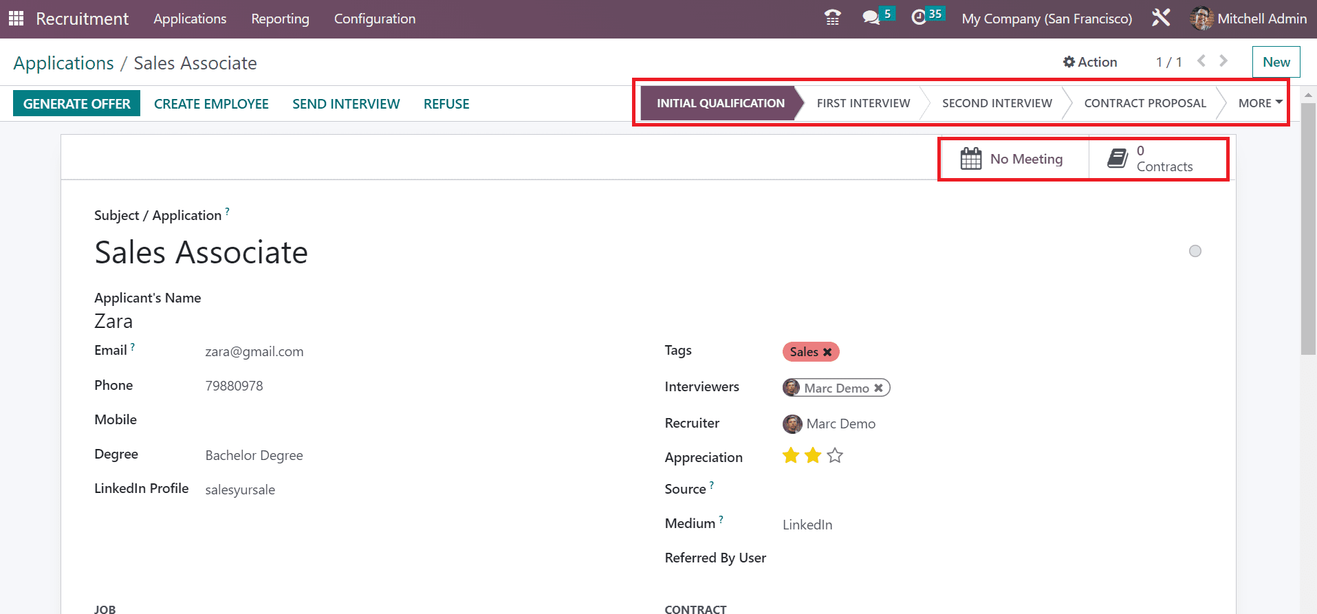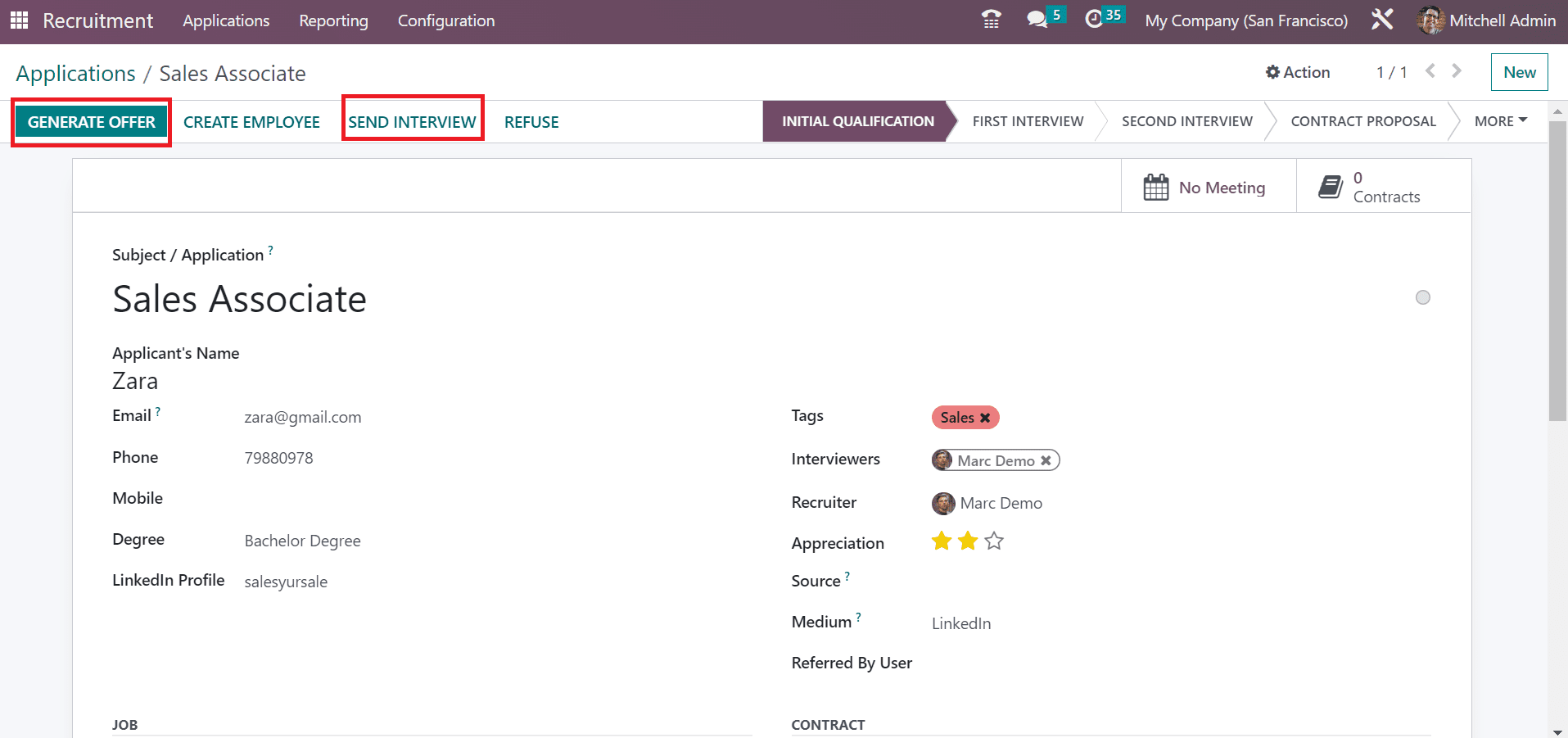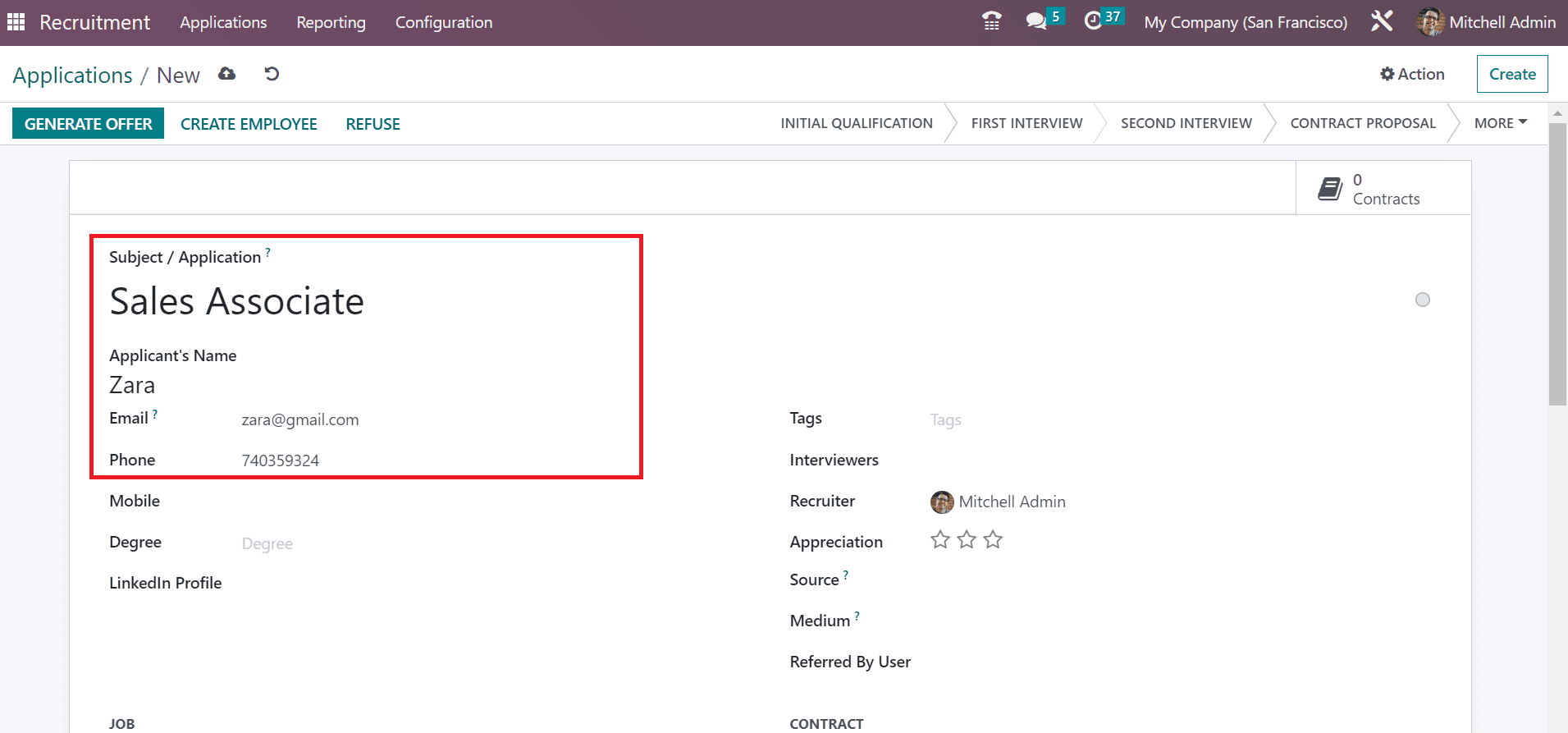 Below the Job section, you can select the job applied by the candidate and the job department. Later, choose your firm name from the Company option. Inside the Contract section, the user can mention the salary expected by the applicant in the Expected Salary field and given by the employer in the Proposed Salary option.