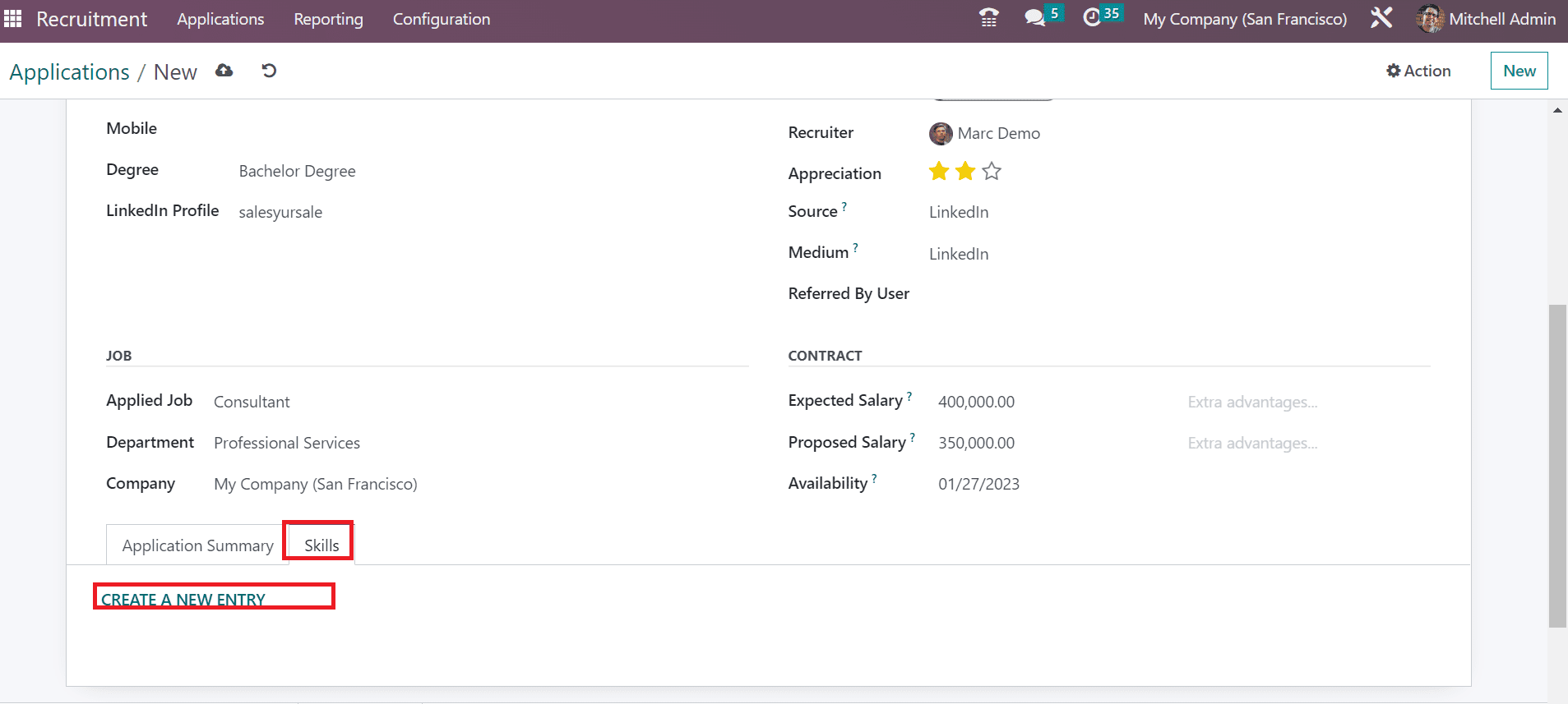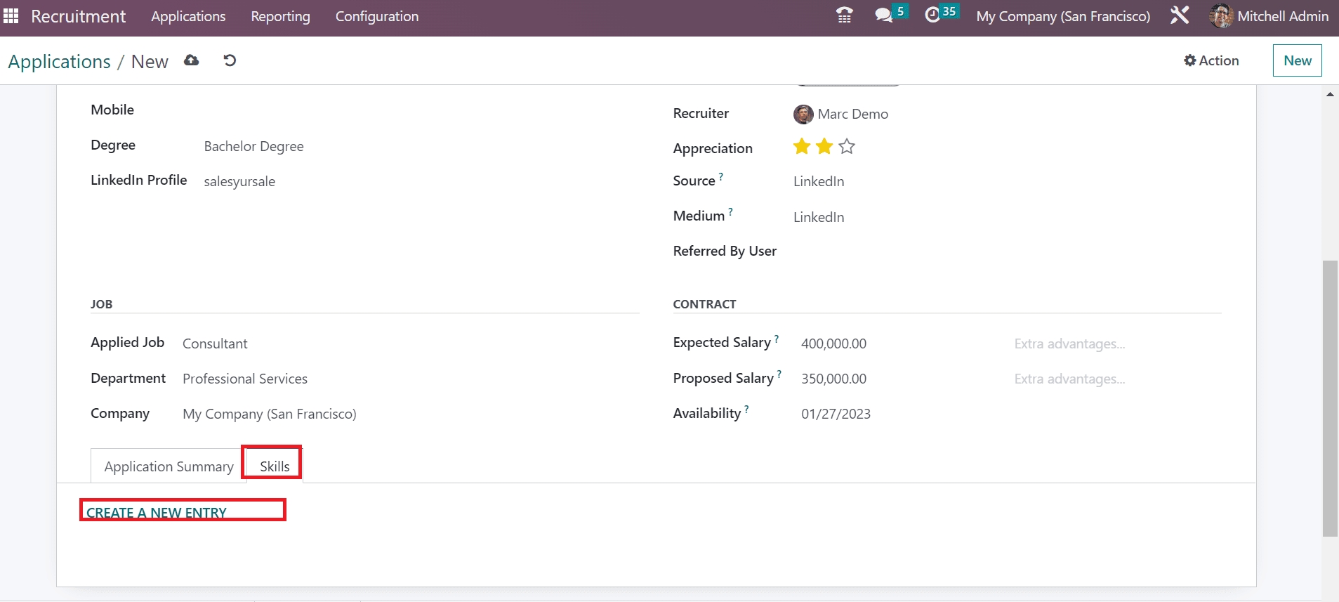 Users can specify the description of an application under the Application Summary tab. Moreover, it is possible to add the necessary skills of the applicant within the Skills tab once pressing the CREATE A NEW ENTRY icon.