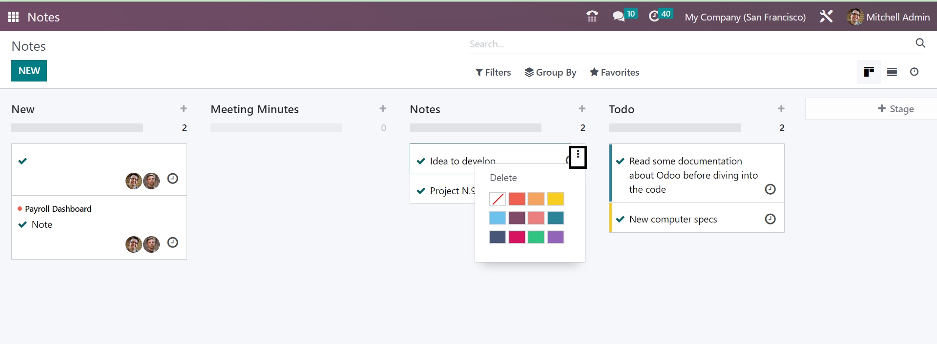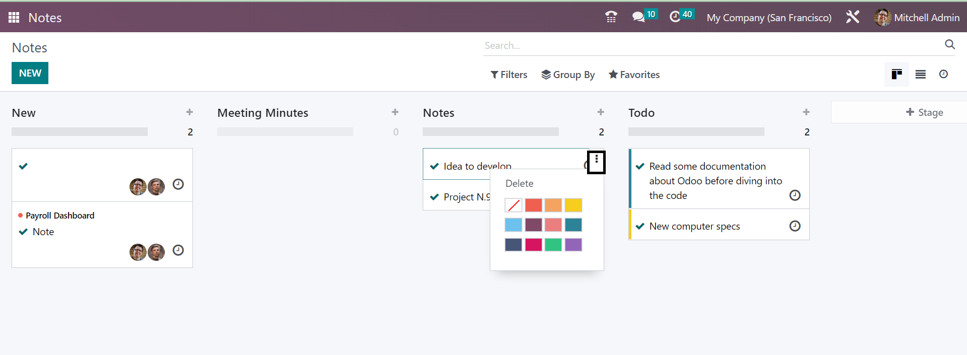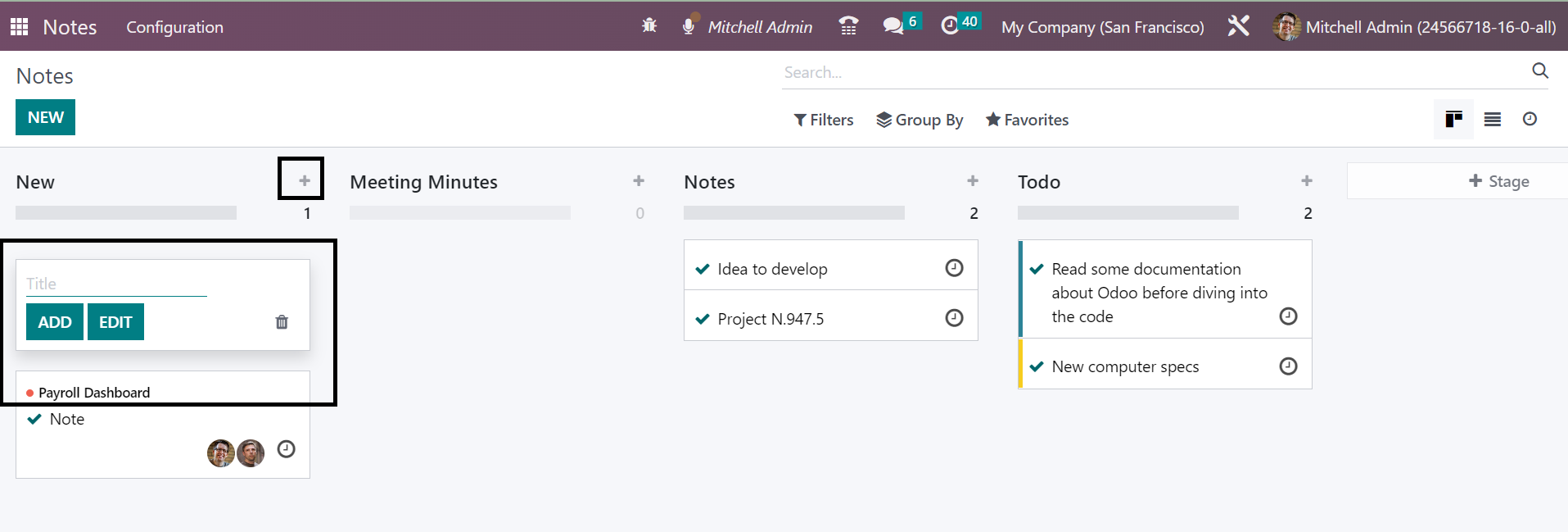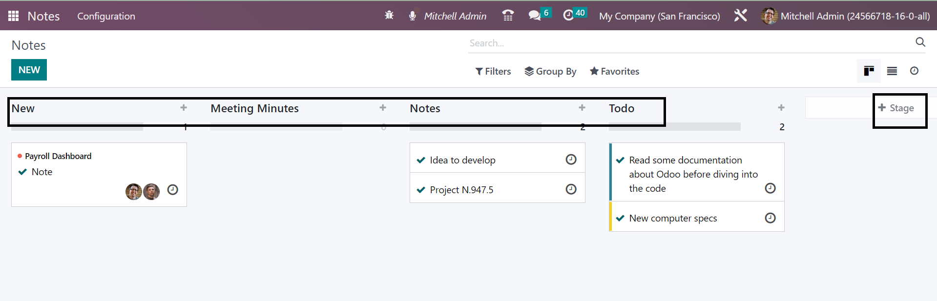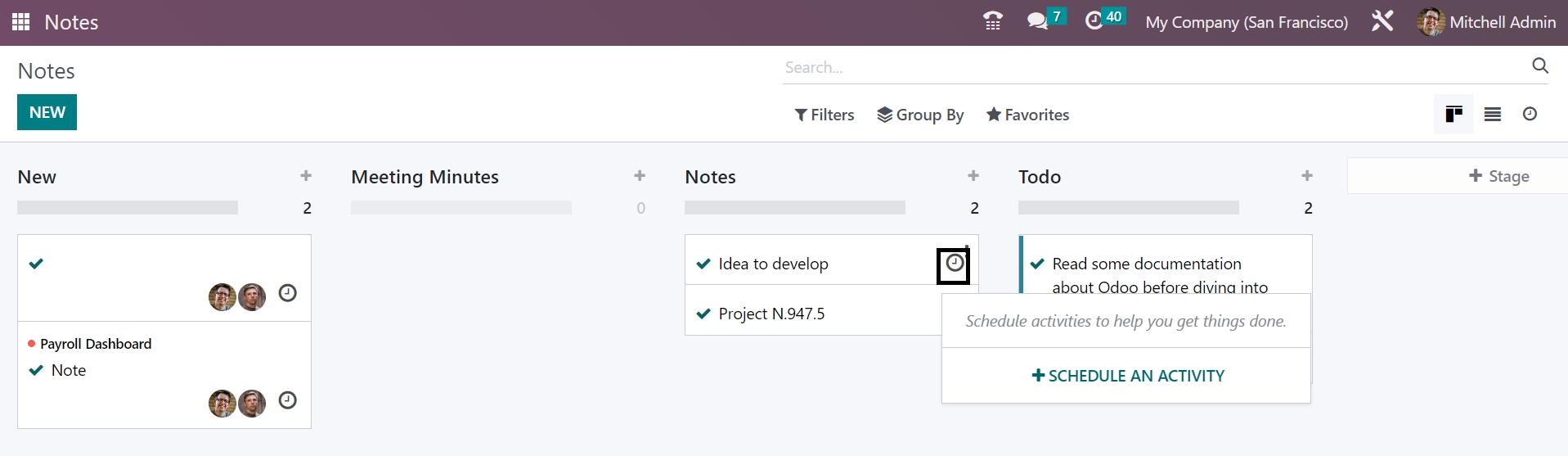 There is a Notes module for this purpose of saving all those important data in the system for future needs. All those notes will be defined in various stages under the Odoo platform, as shown in the image below. You will get the stages, such a sNotes, Minutes of Meeting, and ToDo list in separate stages, and finally, a stage option to make a similar kind of stage by your own if required. You can make use of the Filters and Group By options if required for easily sorting options. The Page can be seen in Kanban, List, and Activity forms according to our priority.