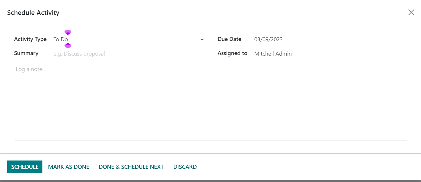 On the schedule activity creation page, you can provide the activity type from the drop-down menu. The summary of the activity can also be provided in the allotted space. Now, under the due date option, the date can be mentioned along with the person to whom the activity is being assigned. If you select the activity type as Meeting, then you will get the calendar view of the page, and their activities can be assigned using the calendar.