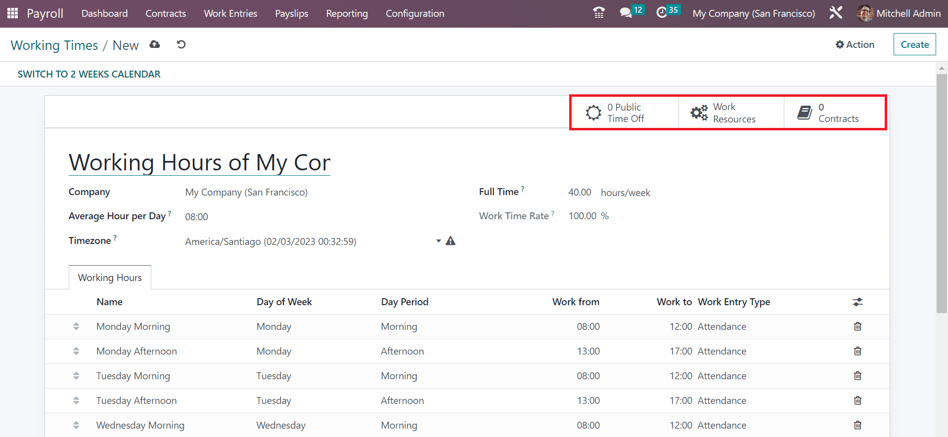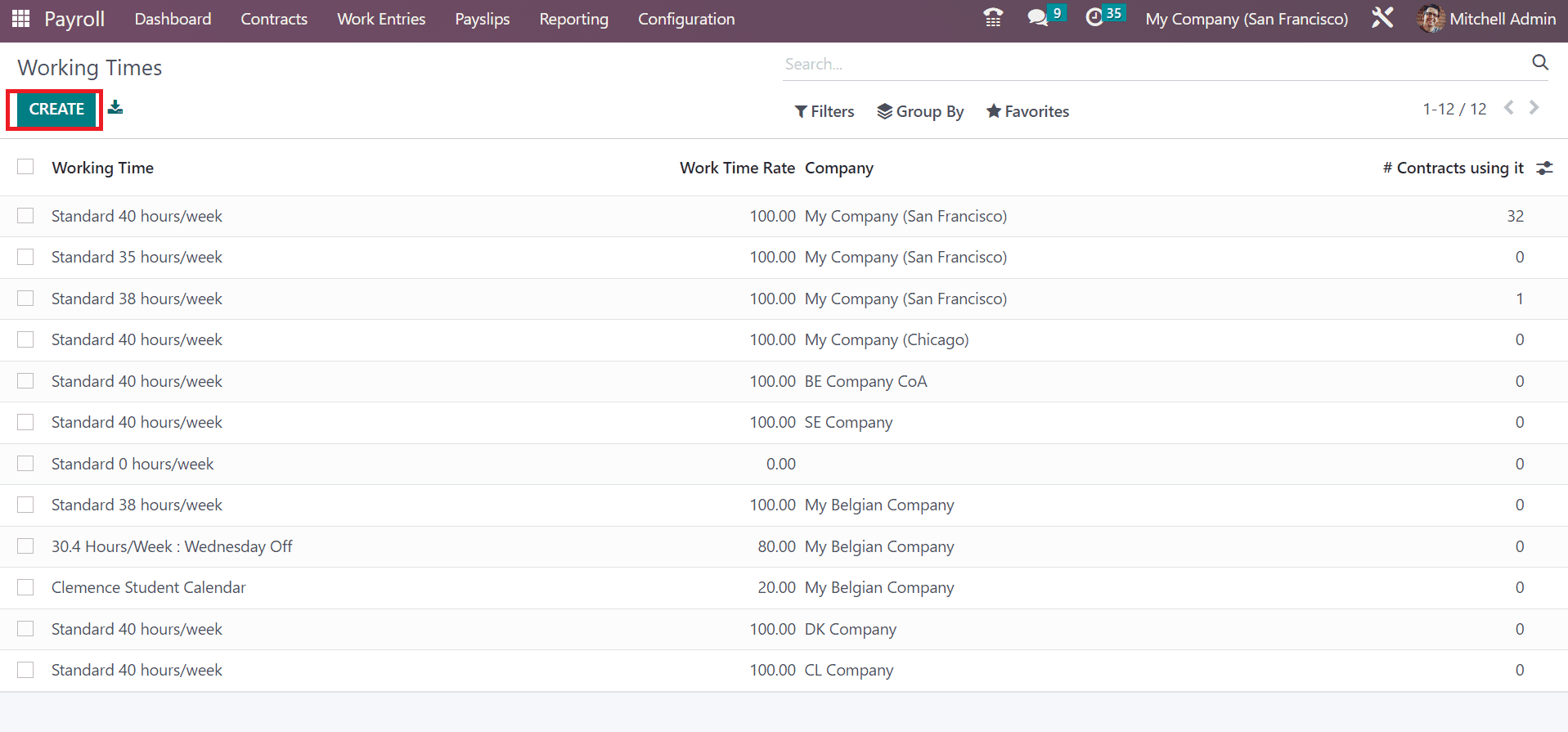 Users can manage their working times easily within the Odoo 16 Payroll module. It helps you to improve organisational productivity. Employees and employers get the flexibility to attain maximum potential. Choose the Working Time menu within the Configuration tab of Odoo 16 Payroll. In the Working Times window, we can see the data such as Work Time Rate, Contracts using it, Working Time, and Company. After clicking on the CREATE icon, you can design a new working time for employees.