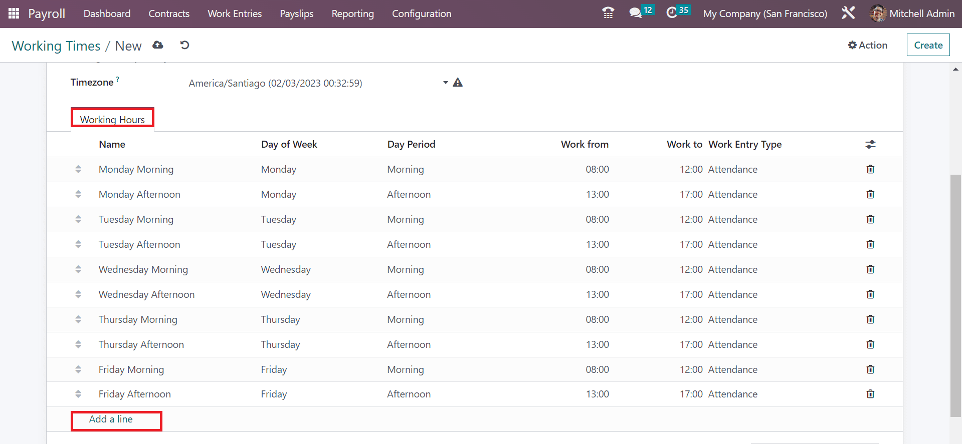 Inside the Working Hours tab, the user can apply a new working hour for an employee once choosing the Add a line option. User can specify the Name, Day period, Work Entry Type, Day of Week, Work from, etc, under the Working Hours section.