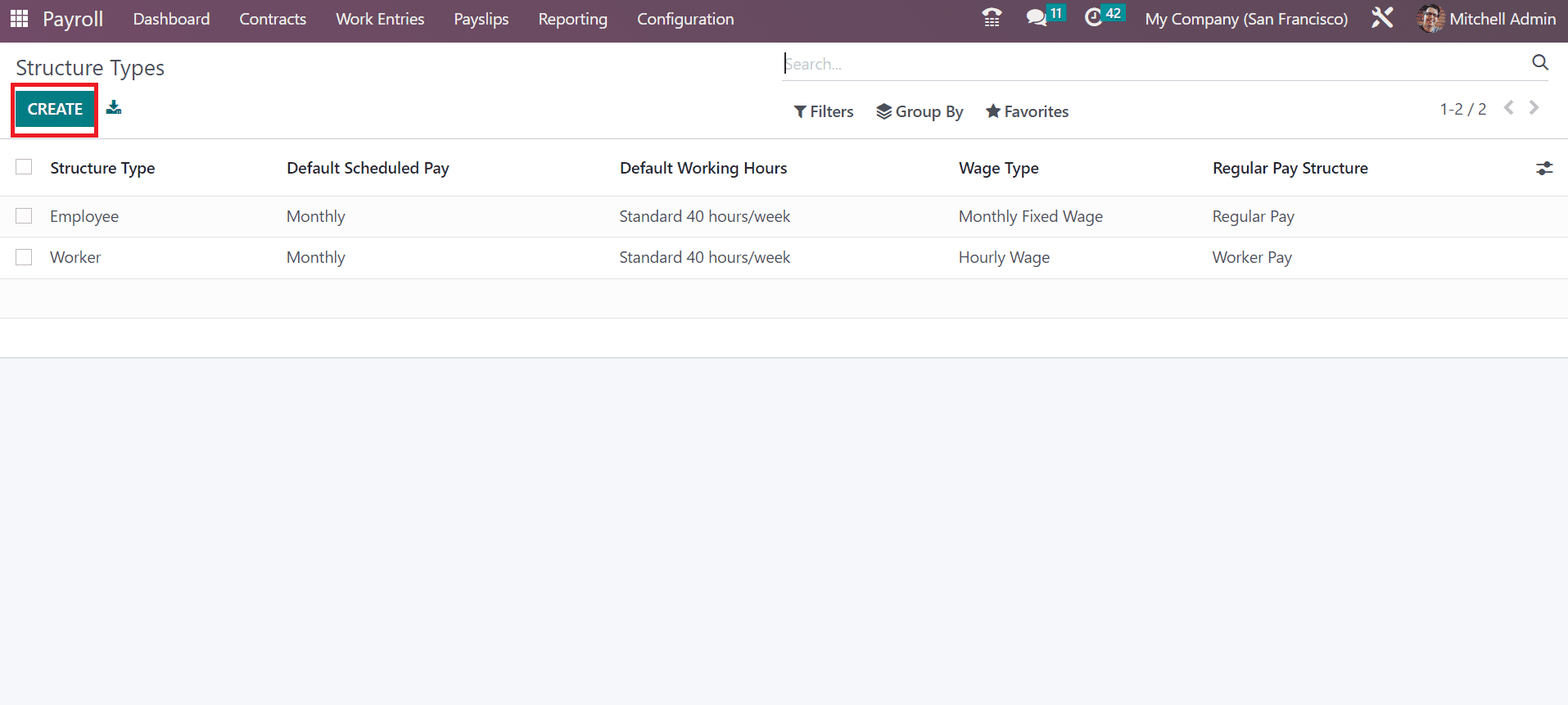It is possible to configure new salary structure types within the Odoo 16 Payroll. Within the Odoo Payroll system, users can define salary structure for trainees, employees, and workers once describing the wage types on a monthly, hourly/weekly basis. Users can define the salary structures of employees after choosing the Salary structures menu in the Configuration tab. In the Structure Types window, we can attain information such as Wage Type, Default Scheduled Pay, Structure Type, Regular Pay Structure, and more. Once clicking on the CREATE button, we can design new structure types in Odoo 16.