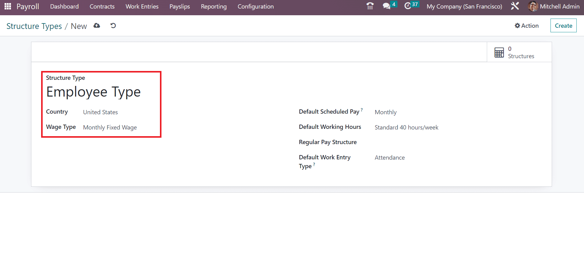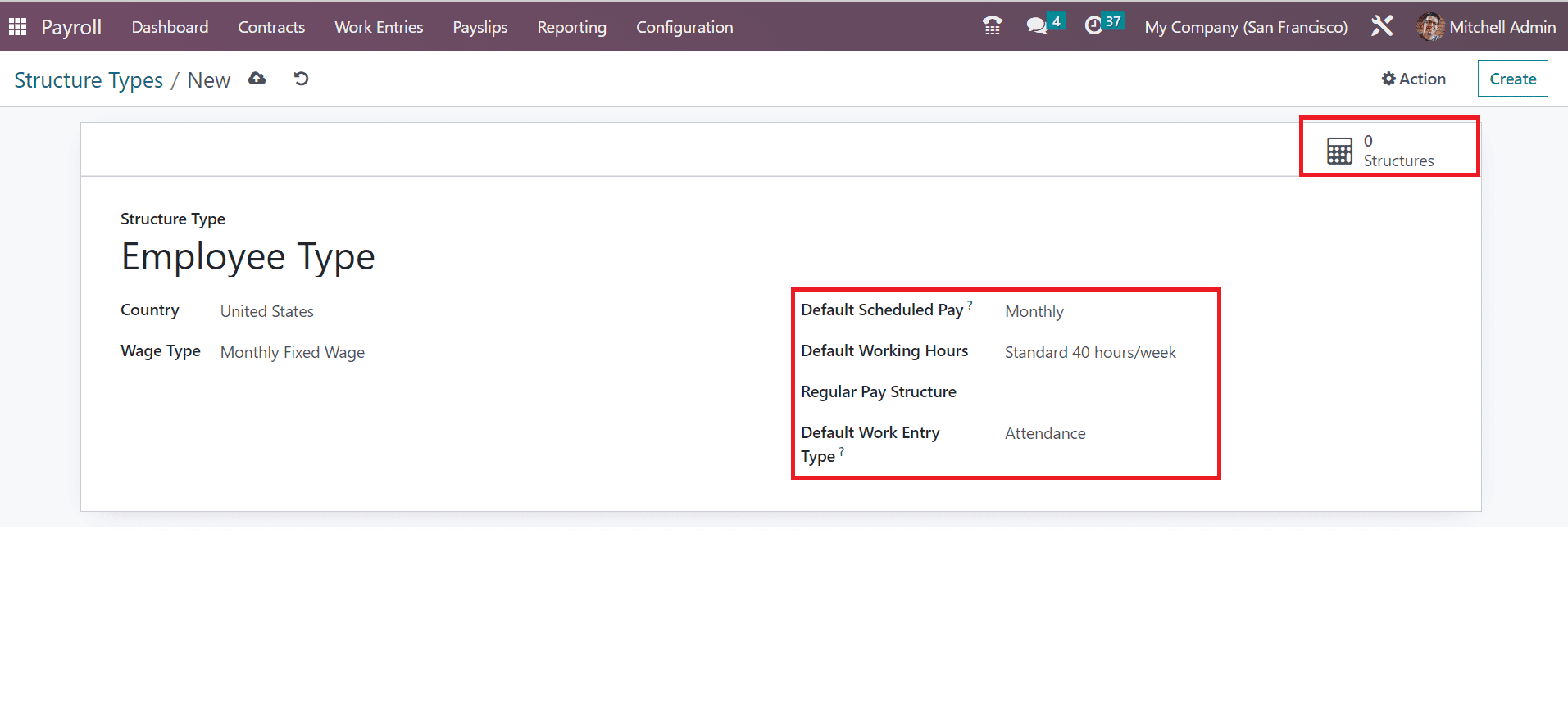 Later, add the wage payment frequency in the Default Scheduled Pay field. Afterward, the user can specify the Default working hours of the salary structure type. We can mention the regular pay structure for employees in the Structure Type window. Finally, you can mention the work entry type concerning regular attendance within the Default Work Entry Type field.