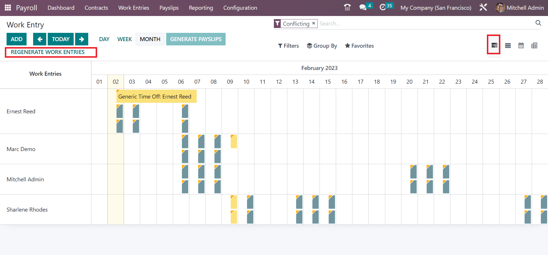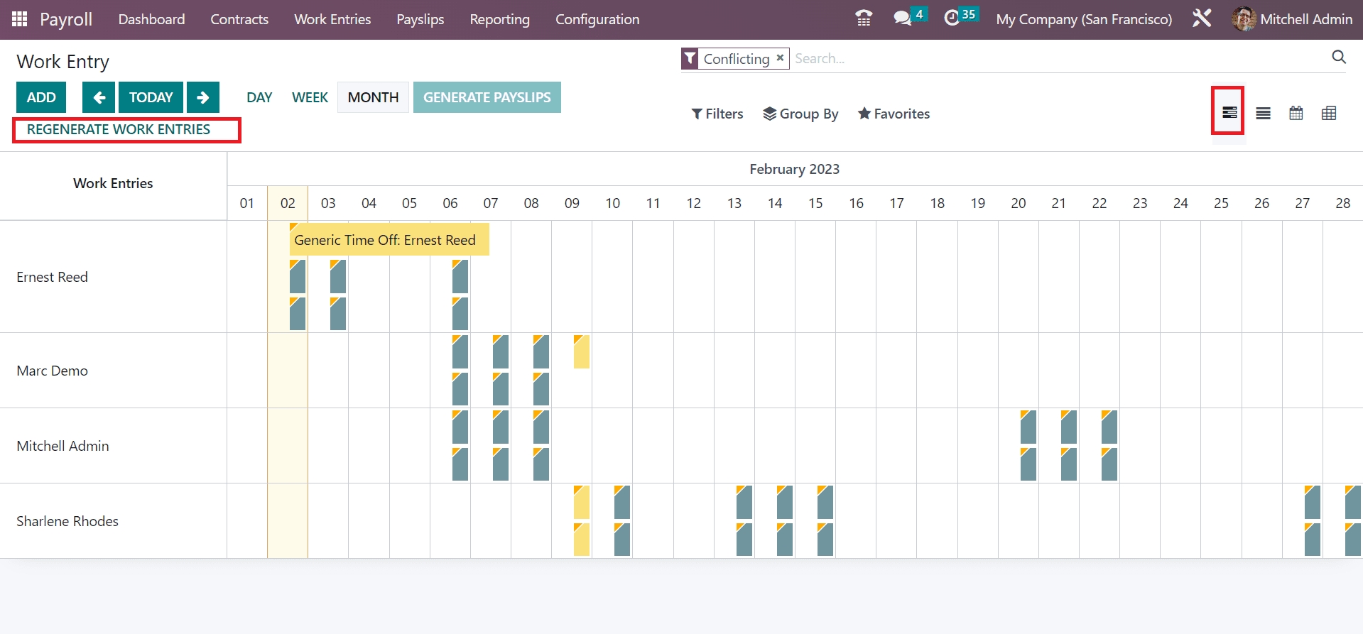 Users can describe the work entries' conflict by picking the Conflicts menu under the Work Entries tab. All the conflicts are arranged in work entries by Odoo 16. The Work Entry window specifies the employee name and conflicting work entries. In the Gantt view, undefined and not validated work entries are visible to the user in the Work Entry window. You can redevelop work entries after clicking on the REGENERATE WORK ENTRIES button.