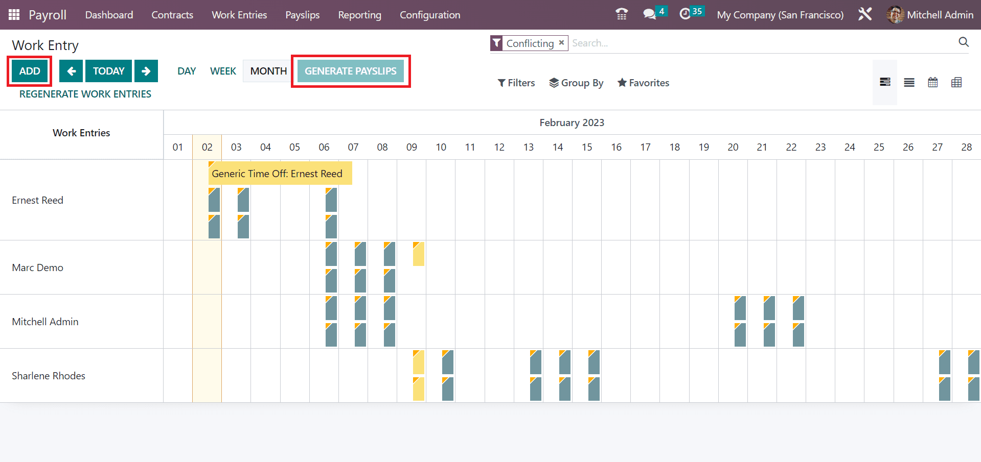 Choose the ADD icon to define a new conflict work entry. We can quickly produce payslips by pressing the GENERATE PAYSLIPS icon in the work entry window.