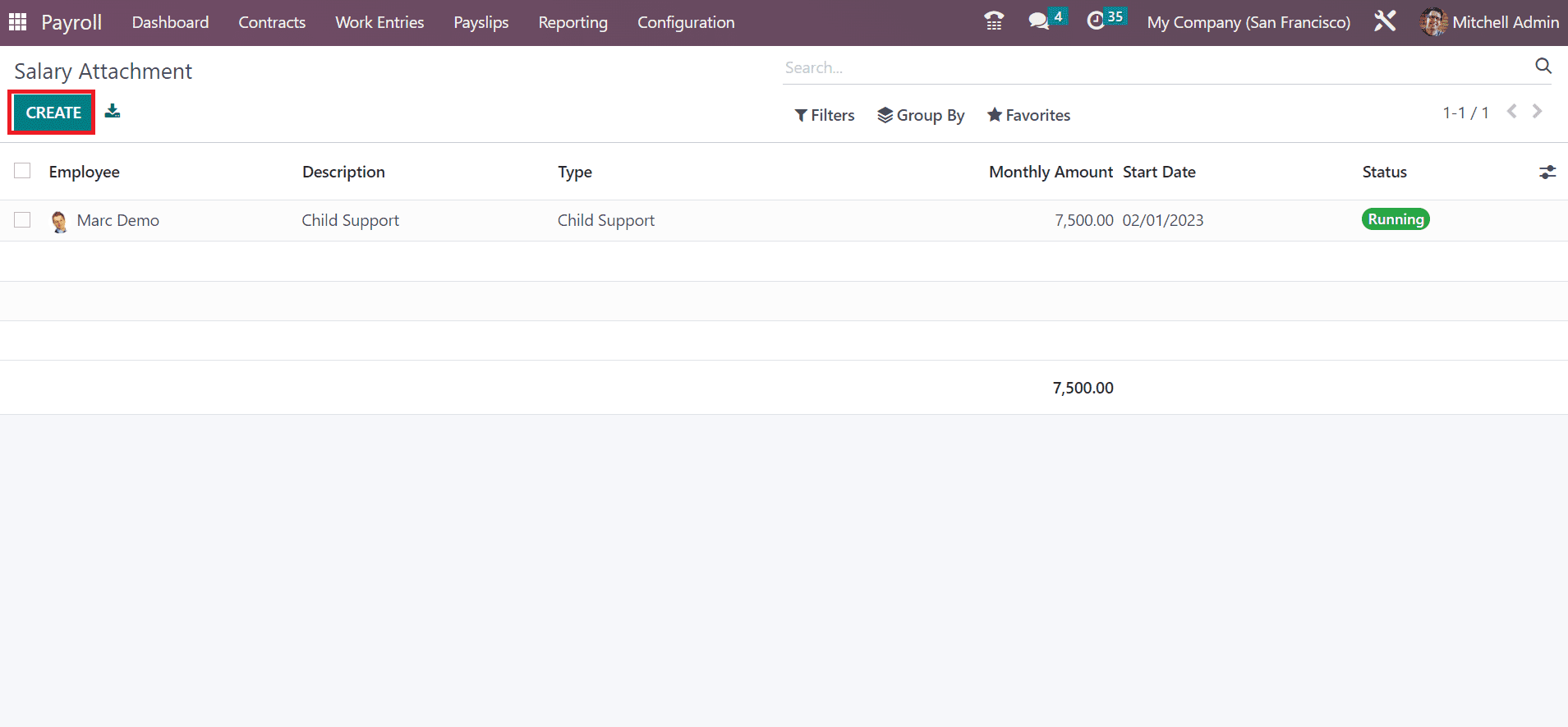 We can obtain the list of all salary attachments of employees by clicking on the Salary Attachments menu inside the Contracts tab. You can acquire the data concerning each salary attachment, including Employee, Type, Status, Description, Start Date, and more. By choosing the CREATE button, we can develop a new salary attachment in Odoo 16 Payroll.