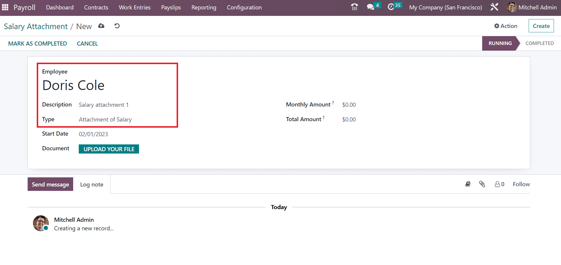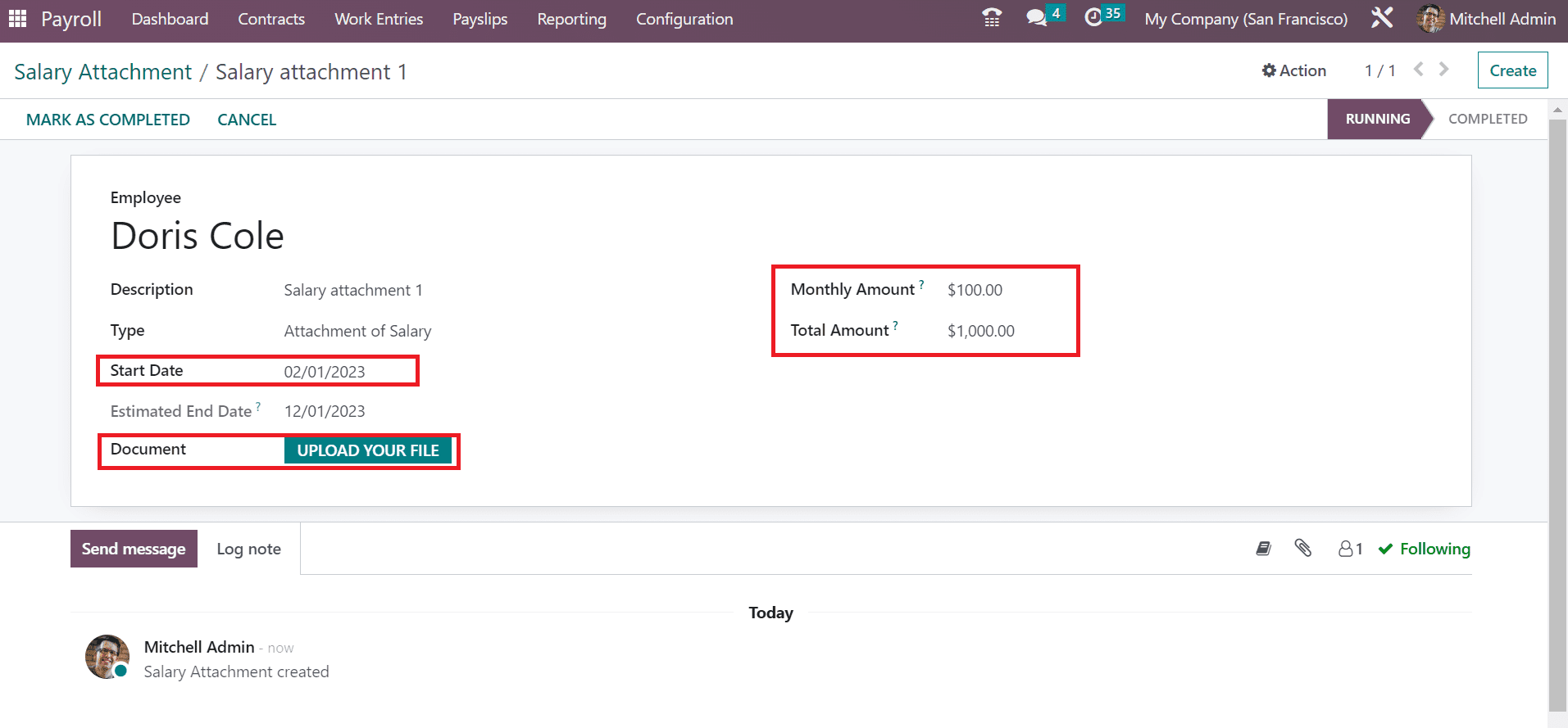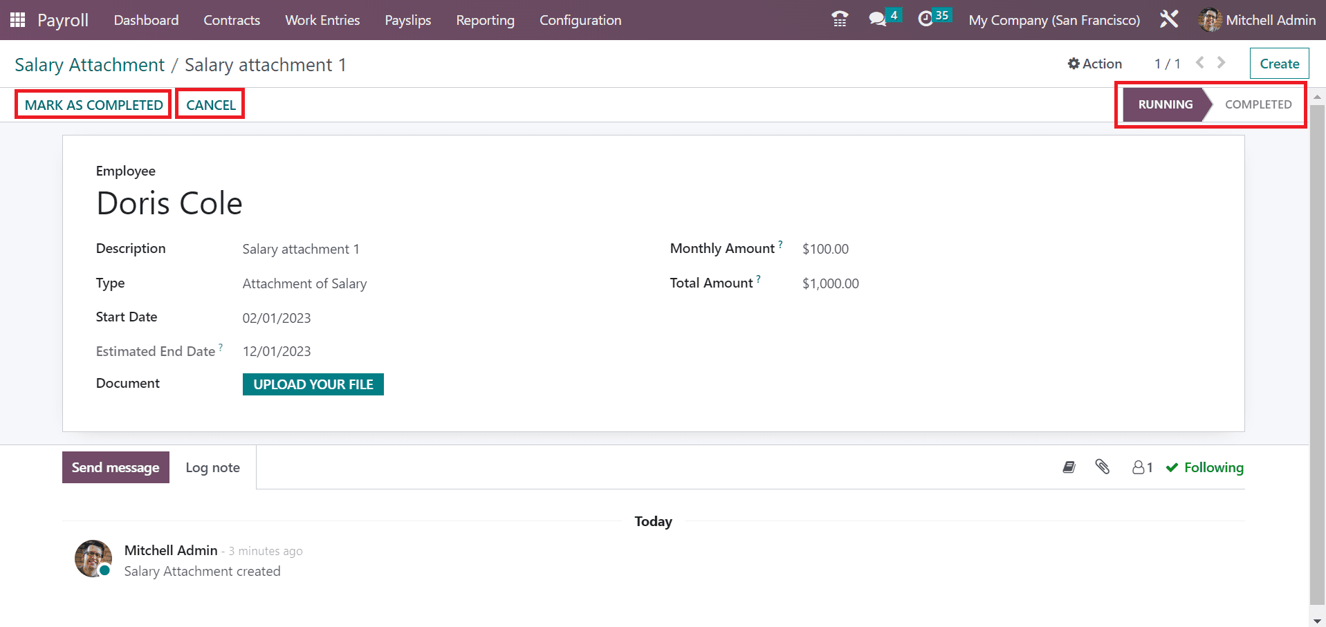 Each data is saved manually in the Odoo 16 Payroll. You can mark the stage as COMPLETED once selecting the MARK AS COMPLETED icon. By choosing the CANCEL button, your specific salary attachment for an employee will be canceled.