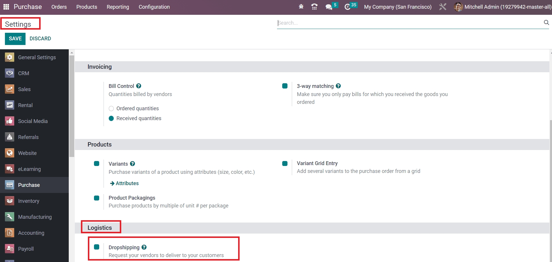 The Dropshipping method in Odoo can be activated from the Settings menu of the Purchase module. As you can see in the image below, the option will be available under the Logistics tab.