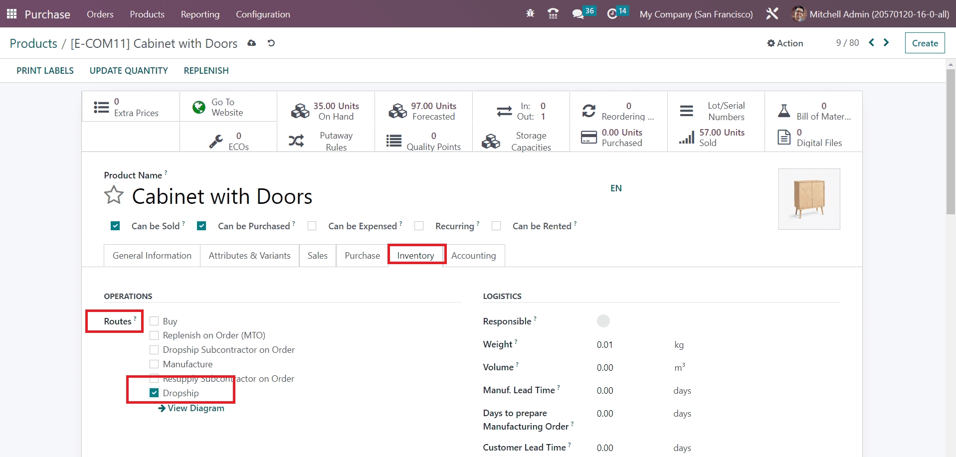 Now, you can configure the product that you want to dropship and set the routes of operation as Dropship as shown in the image below. The option can be seen under the Inventory tab of the product detail form.
