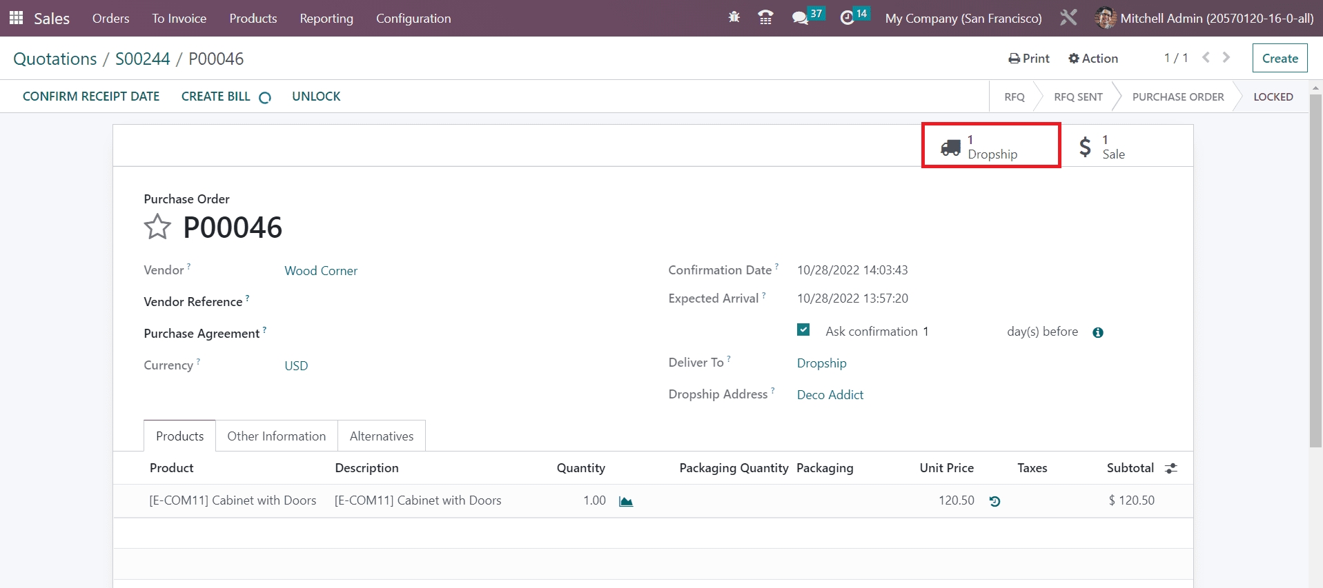 Here, you will get the operation type of the incoming shipment and the Dropship Address. Once you confirm the purchase order, the product will be directly delivered to the customer from the respective vendor. You don’t need to keep an inventory for this product in the case of the dropship.