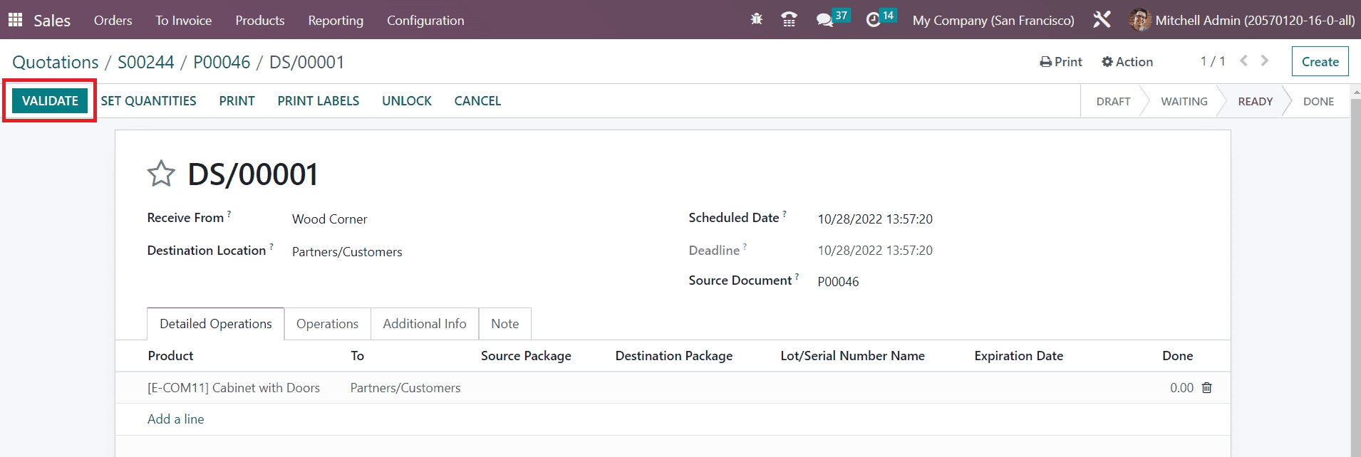 Clicking on the Dropship smart button will lead you to a new window where you can Validate the Dropship.