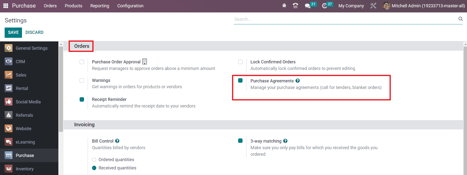 Activate the Purchase Agreement option from the Orders tab. Earlier in Odoo 15, you can find an additional platform to define the agreement types under the Configuration menu after activating this option. But in Odoo 16, there are some changes in the configuration of agreement types.