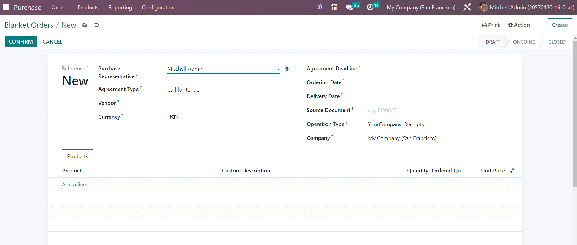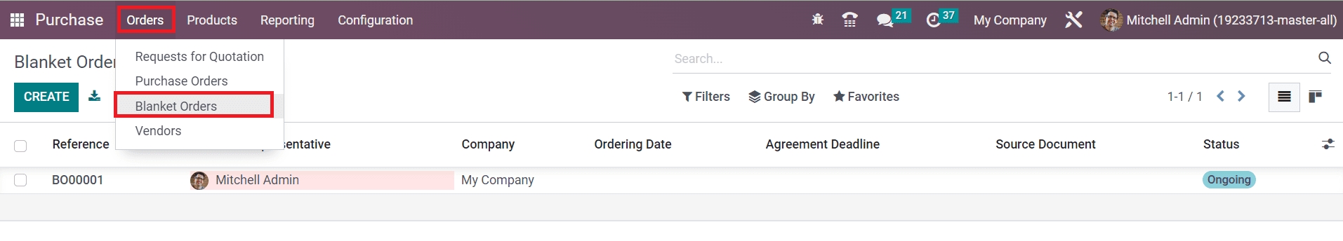 The preview of the list will show the Reference, Purchase Representative, Company, Ordering Date, Agreement Deadline, Source Document, and Status. This window provides the option to get a Kanban view also. Creating a new Blanket Order is not a difficult task since we have Odoo.