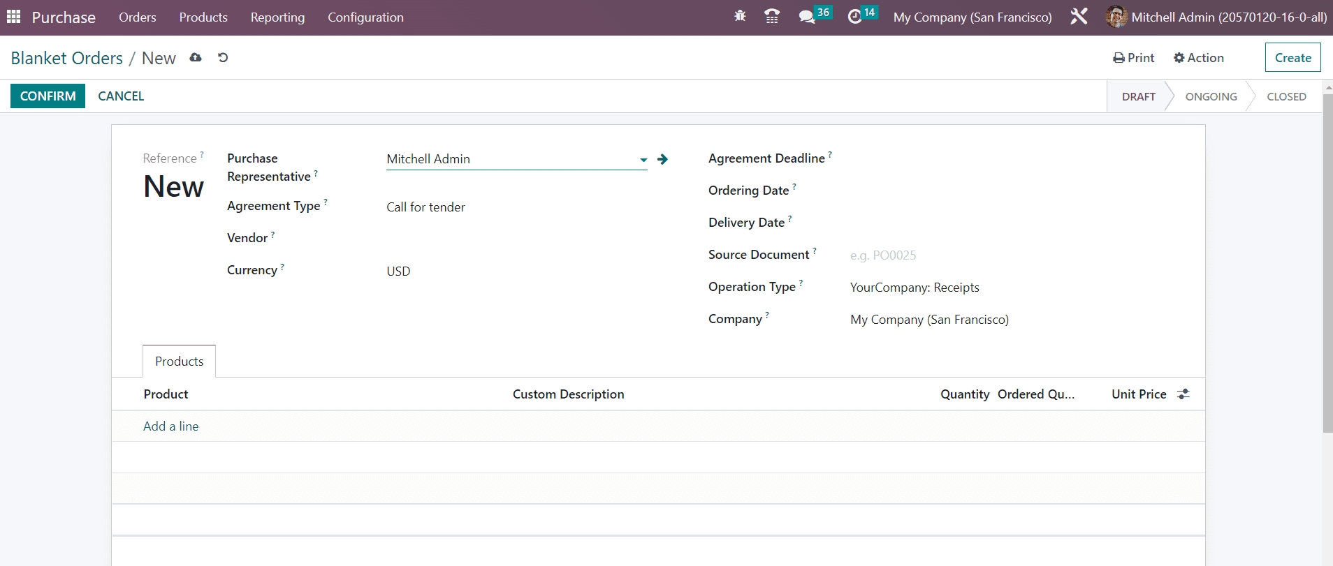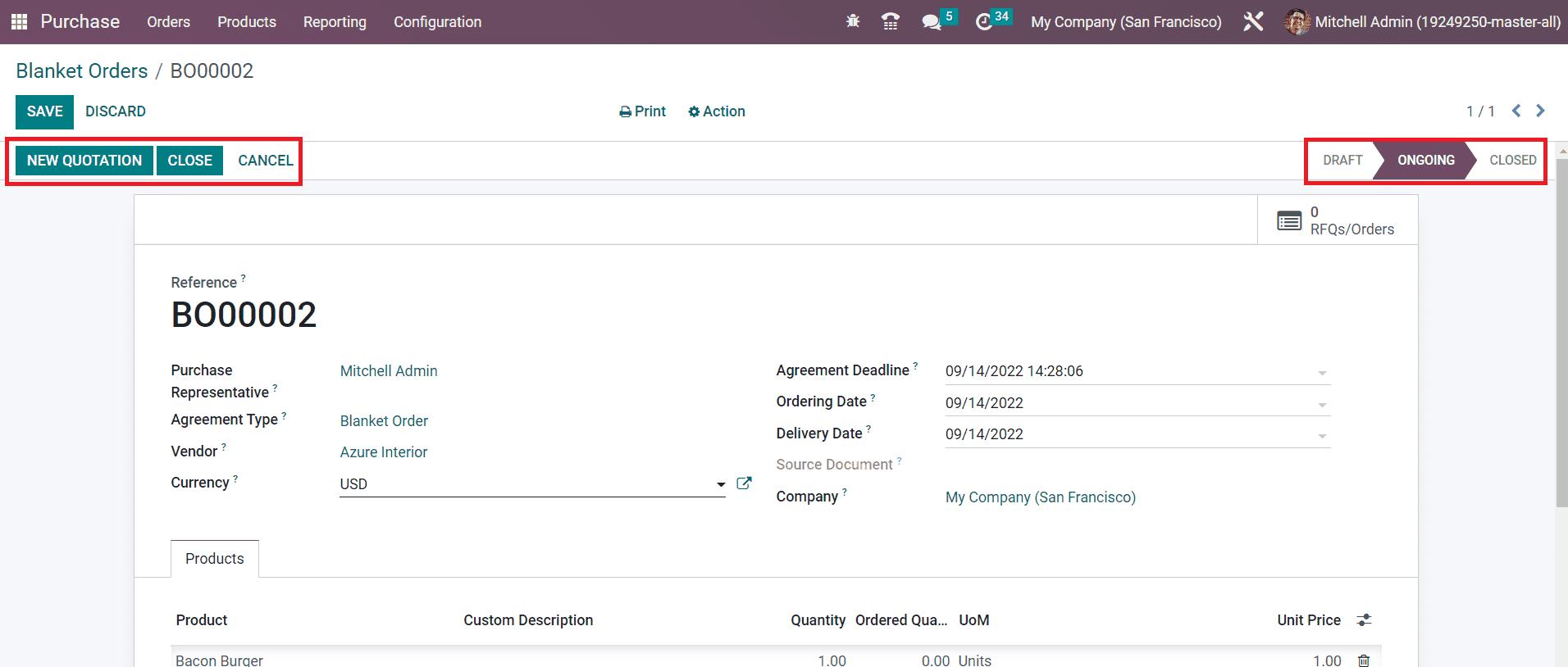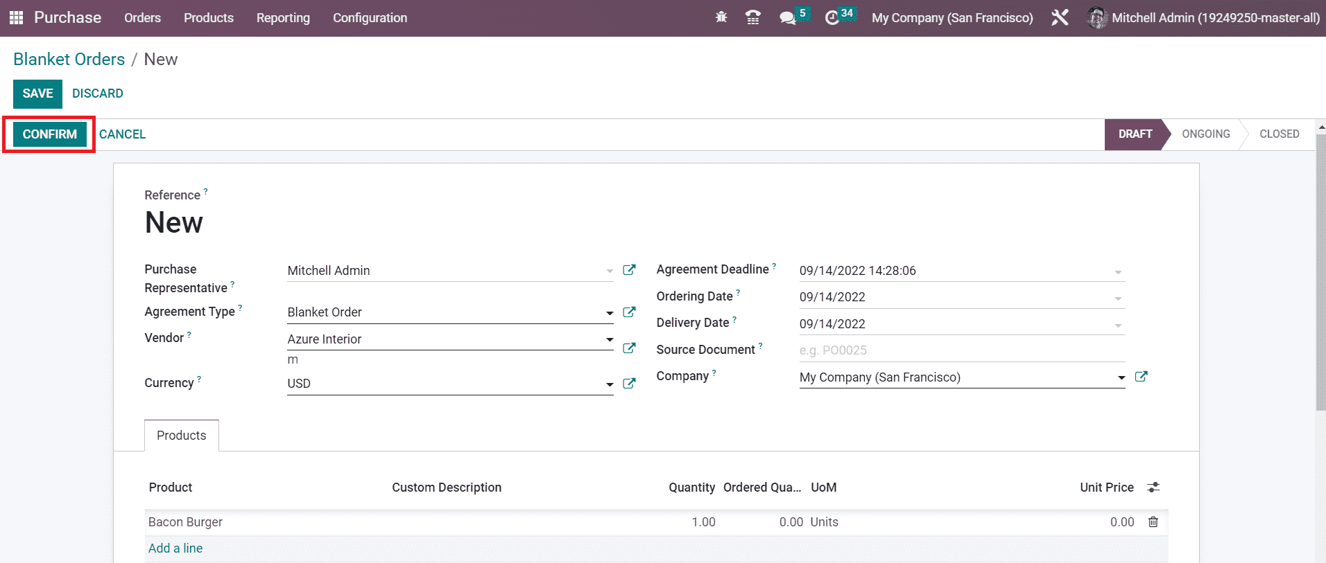Now, you can confirm the banket order using the Confirm button. As soon as you confirm the blanket order, Odoo will change its status from Draft to Ongoing. The agreement will be moved to the Closed status automatically once it reaches the agreed deadline.
