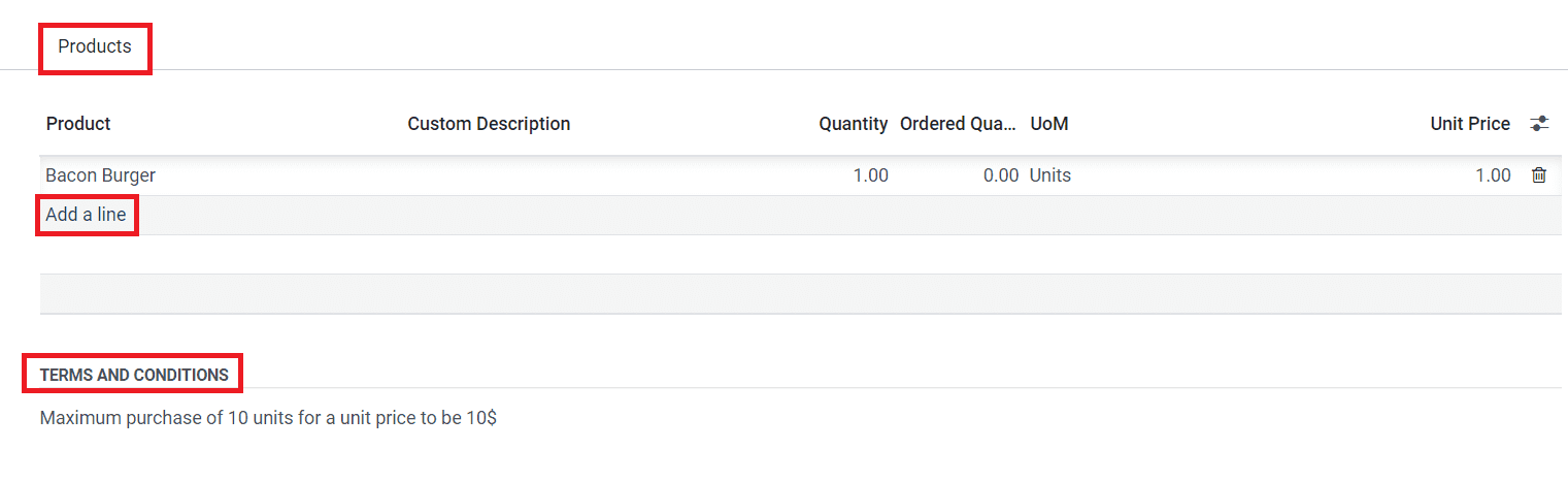 Using the Add a Line button, the products that you want to include in the purchase agreement can be added one by one under the Products tab. Don’t forget to mention the Unit Price of the products that you added to the contract.
