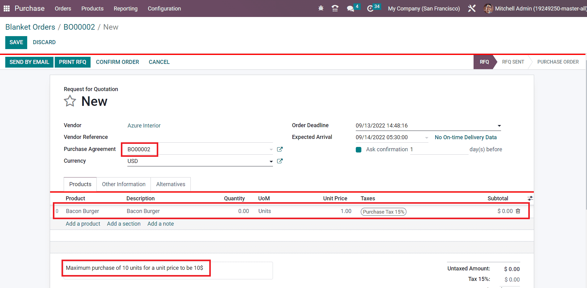 The details mentioned in the purchase agreement will automatically appear in the respective fields of the RFQ as shown in the image above. You can verify the details and manage the RFQ just as we discussed earlier in the section Request for Quotation. You can use this blanket order multiple times to purchase the same product from the same vendor within the agreed deadline.