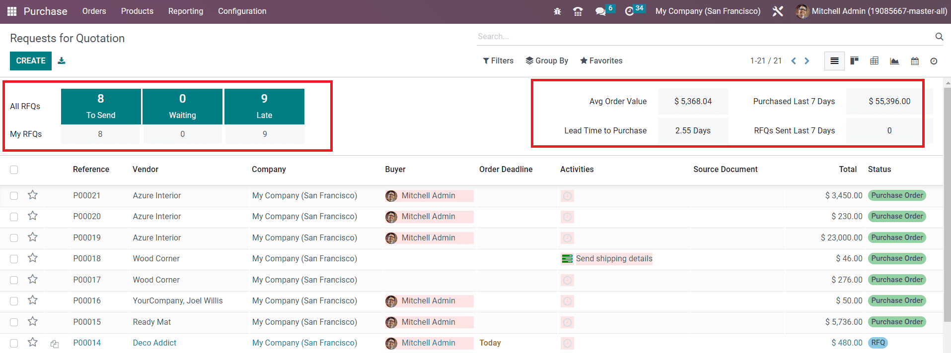As highlighted in the image above, you will be able to get the number of All RFQs as well as MY RFQs (the RFQs created by you or assigned to you) in the RFQ window. These fields will show the total number of RFQs to send to respective vendors, RFQs waiting for the confirmation from vendors, and late RFQs separately. Additionally, you will get the details of the Average Order Value, Purchased Last 7 Days (total amount of products purchased within last 7 days), Lead Time to Purchase (average lead time in days from the confirmation of purchases orders to purchase), and RFQs Sent Last 7 Days (total number of RFQs sent within last 7days).