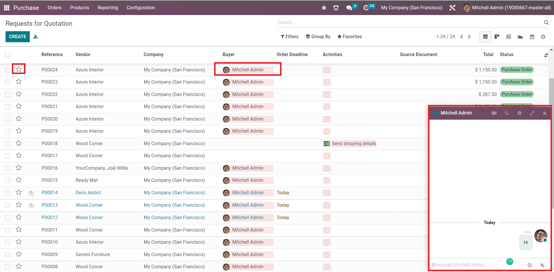 Odoo offers an easy way to communicate with the buyer from the preview of the RFQs itself. Clicking on the name of the Buyer will open a chat box in the window as shown in the image above that will assist you to connect with the buyer.