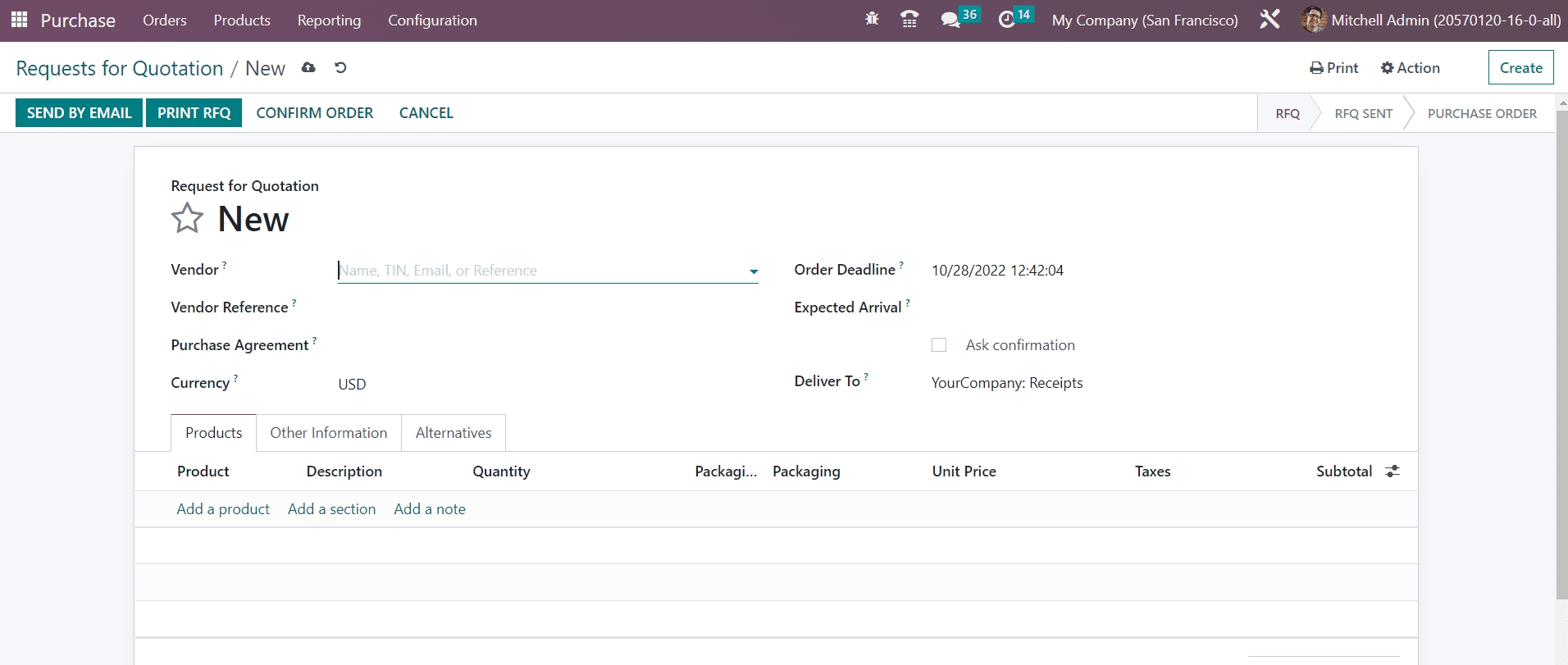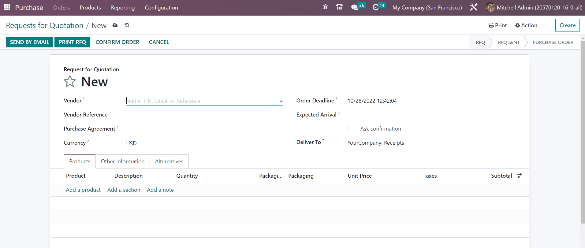 Now, let’s discuss the creation of a new request for quotations. If you want to make changes in the already created RFQs, you are allowed to select the required one from the given list and use the Edit button. Here, we are discussing the configuration of a new request for quotation. For that, you need to click on the Create button and Odoo will lead you to a new creation window as depicted below.
