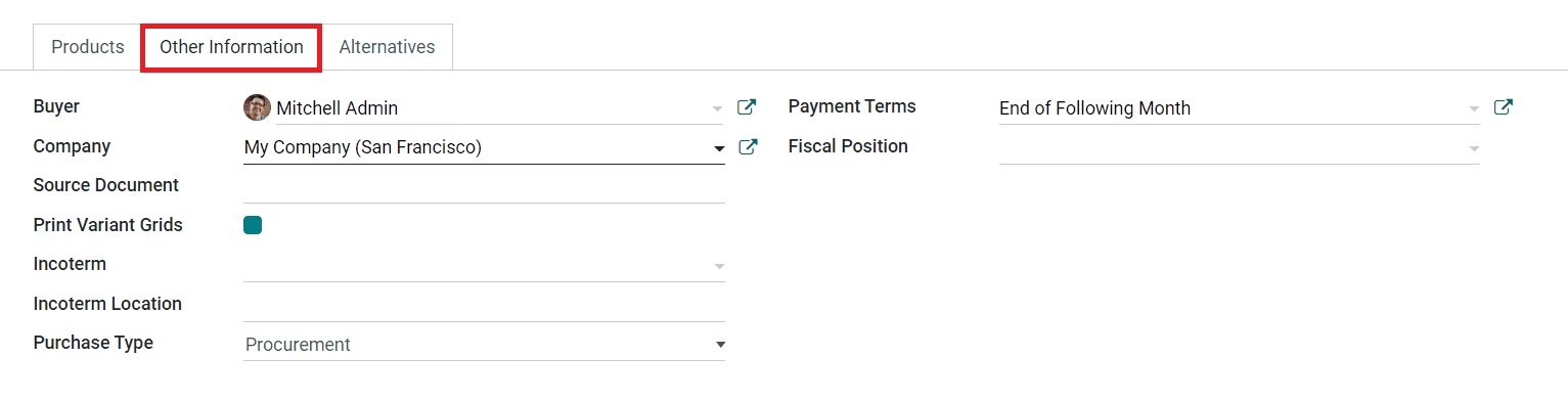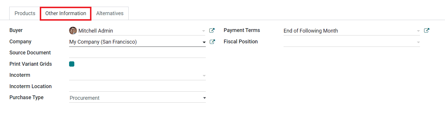 Additional details regarding the quotation can be added under the Other Information tab. Here, you can specify the name of the Buyer, Company, and Source Document in the respective fields. If the Print Variant Grids field is activated, the matrix of the configurable products will be shown on the report of this order. In the Incoterm field, you can specify the international commercial term which is a series of predefined commercial terms used in international transactions along with the Incoterm Location . The type of purchase can be selected as Procurement or Commission according to the agreement in the Purchase Type field. The Payment Terms and Fiscal Positions used for this purchase operation can be defined in the corresponding fields.