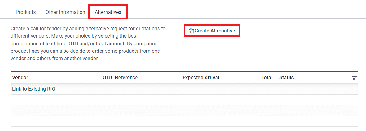 The Alternatives tab is a new feature in the Odoo 16 Purchase module. Here, you can add alternative purchase orders with the same products from different vendors. This tab will help you to create a call for tender by adding alternative requests for quotations to different suppliers. You can create your choices by choosing the best combination of lead time, OTD reference, and total amount.
