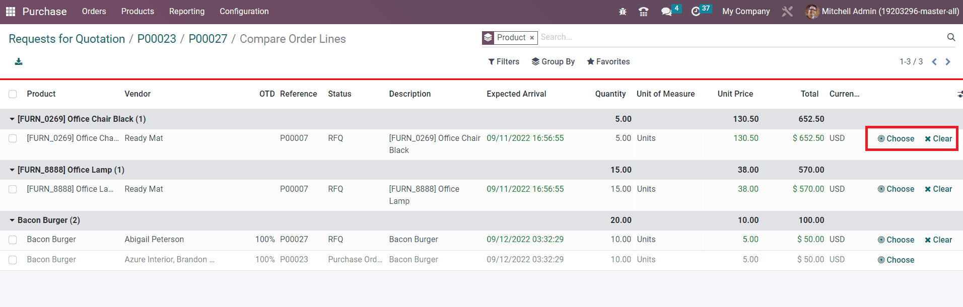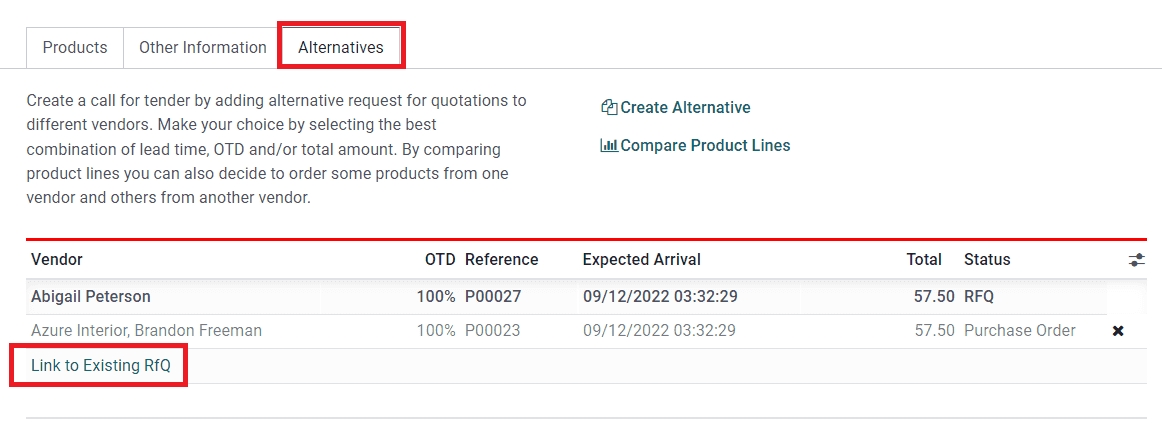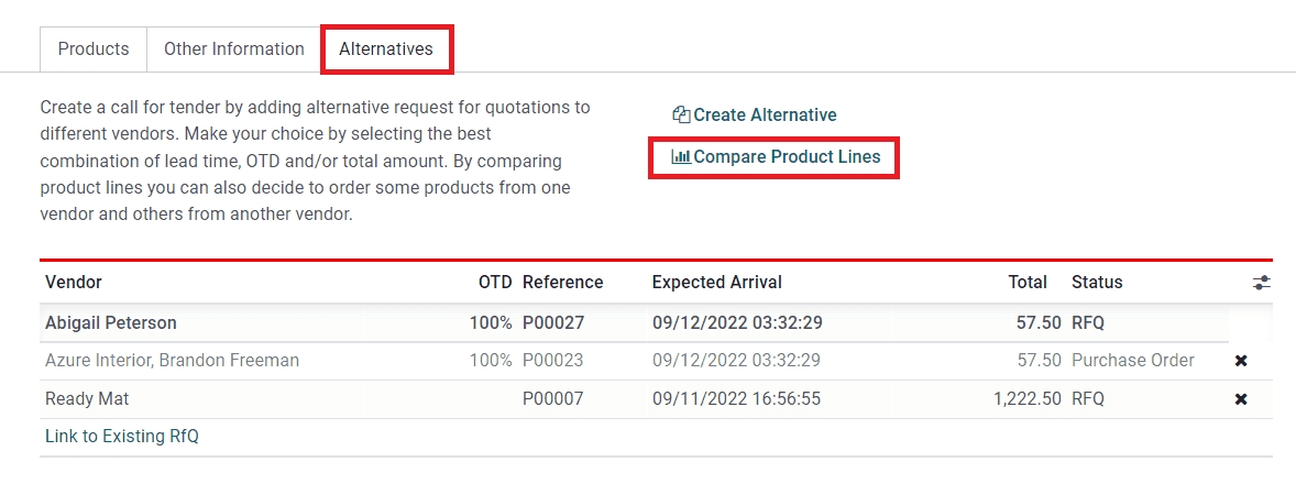 Odoo lets you compare the product line with the help of the Compare Product Lines button. Clicking on this button will direct you to a comparison window where you will get the list view of the alternative purchase orders with the details of the Product, Vendor, OTD Reference, Description, Expected Arrival, Quantity, Unit of Measures, Unit Price, Total, and Currency.