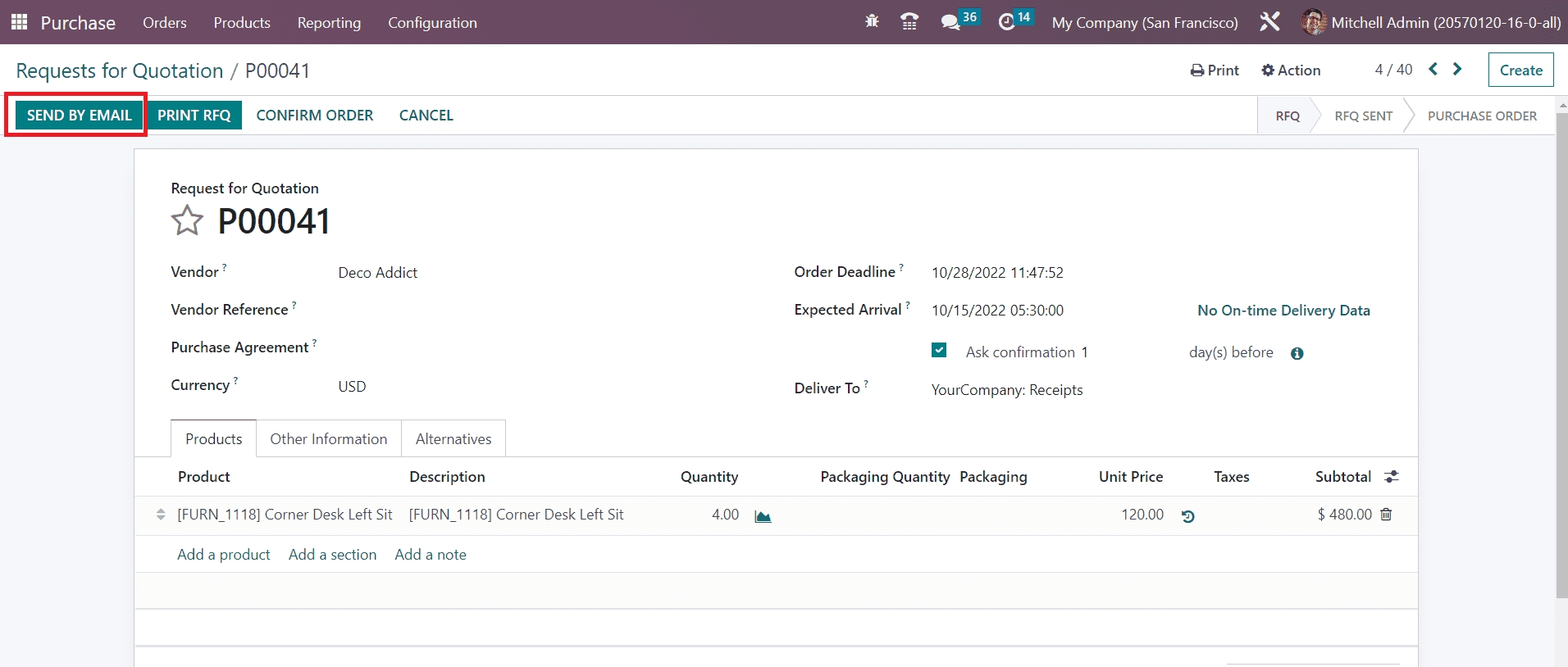 The availability of default and customizable features in the Filters and Group By option will benefit you in simplifying the searching process. You can easily locate required data from the available RFQs using these sorting options within seconds.