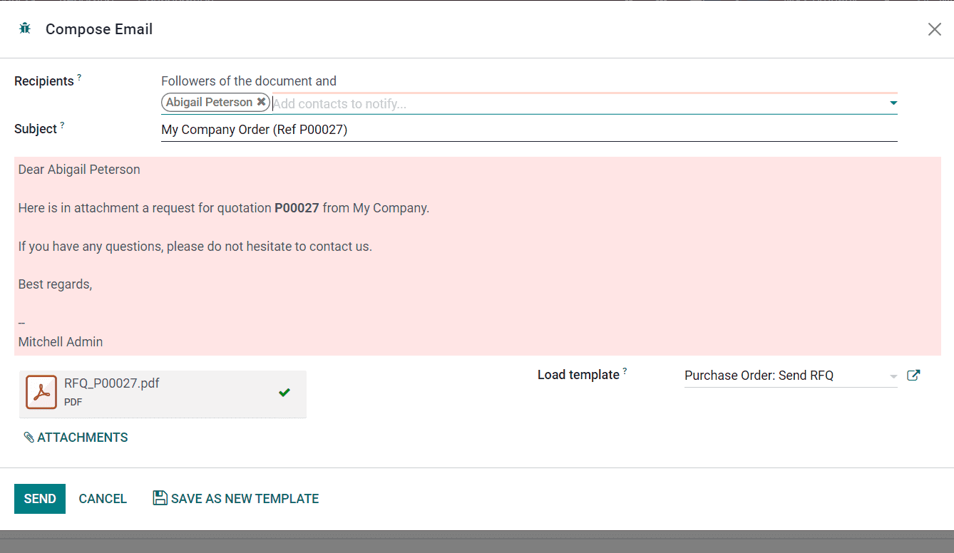 Use the Send By Email button to send this request for quotation to the respective vendor via mail. Once you click on this option, Odoo will generate an automated email template as shown below where you can add the name of the recipients in the Recipients field. You can add additional attachments to the mail using the Attachments button.