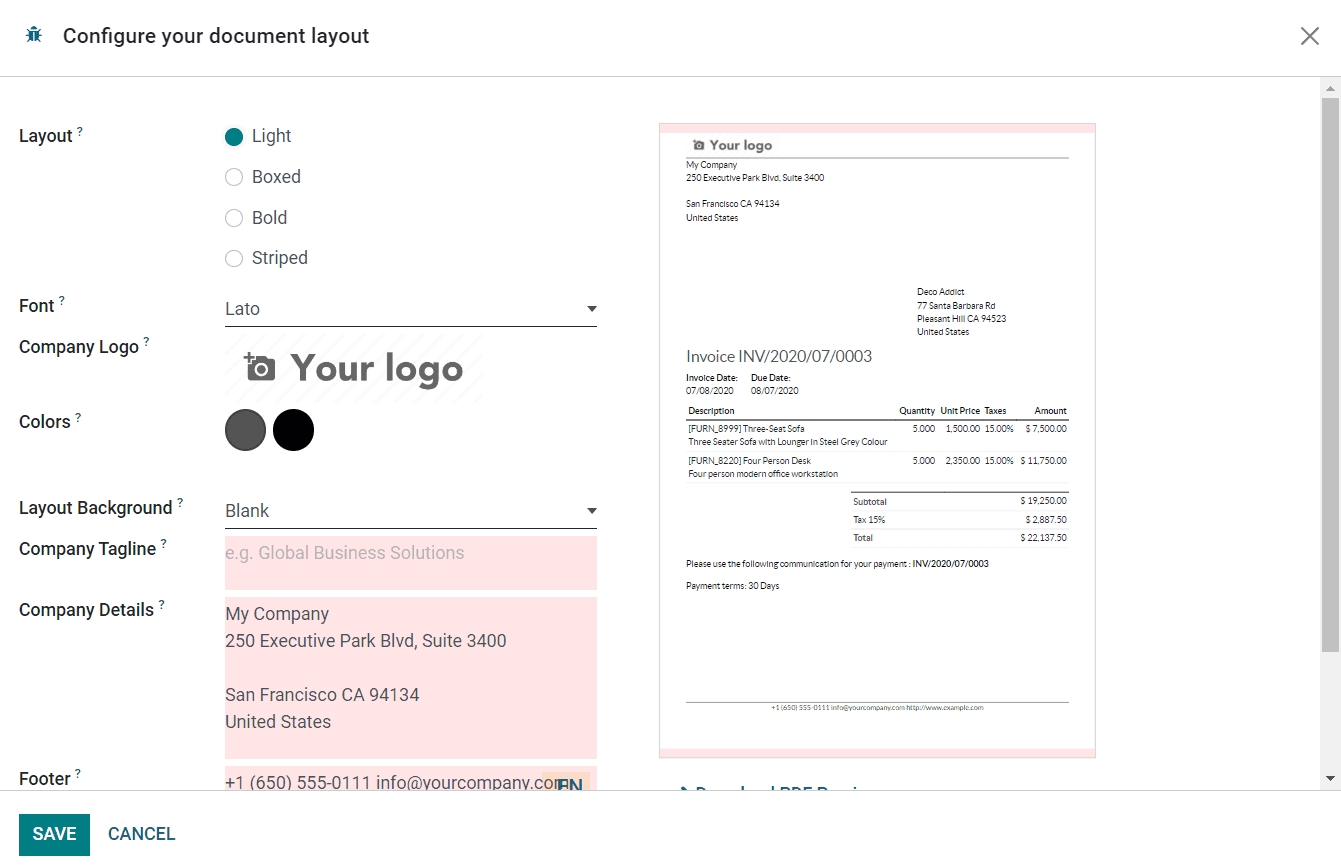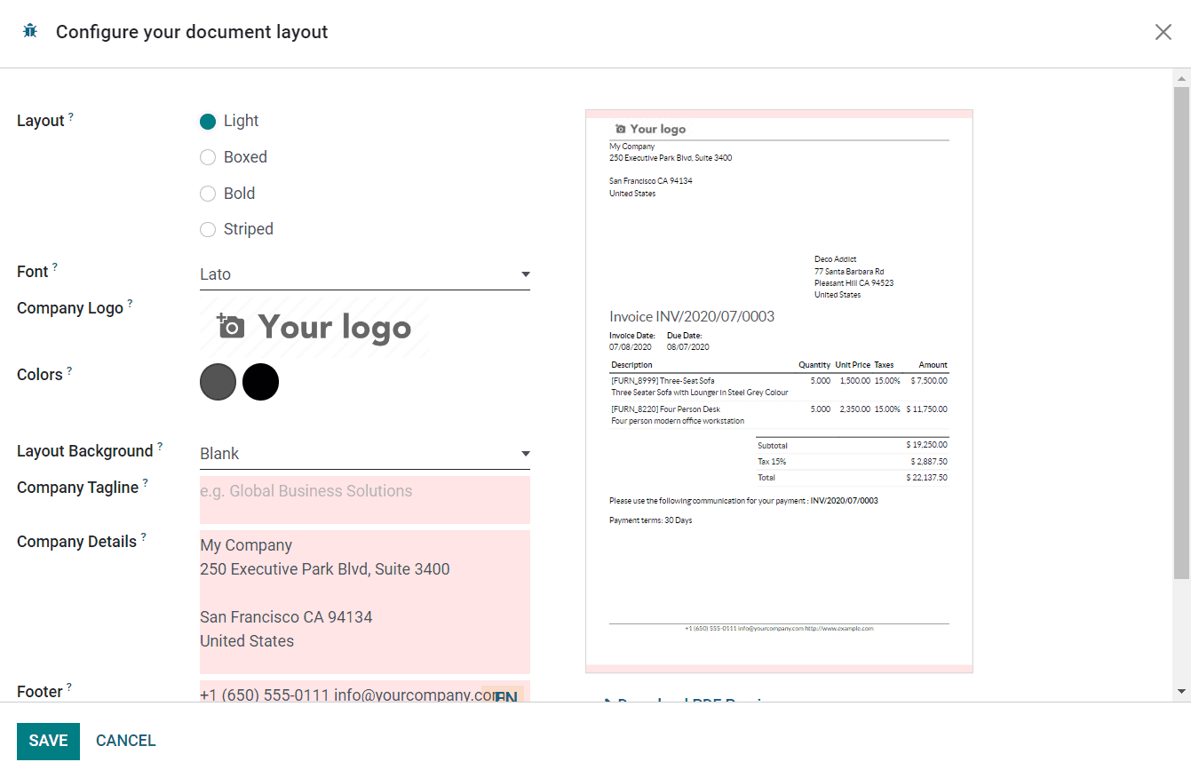 Here, you can select a suitable Layout, Font, Company Logo, Colors, Layout Background, Company Tagline, Company Details, Footer, and Paper Format. The preview of the document based on the option you selected will appear on the right side of the wizard. Clicking the Save button will print your document within seconds.