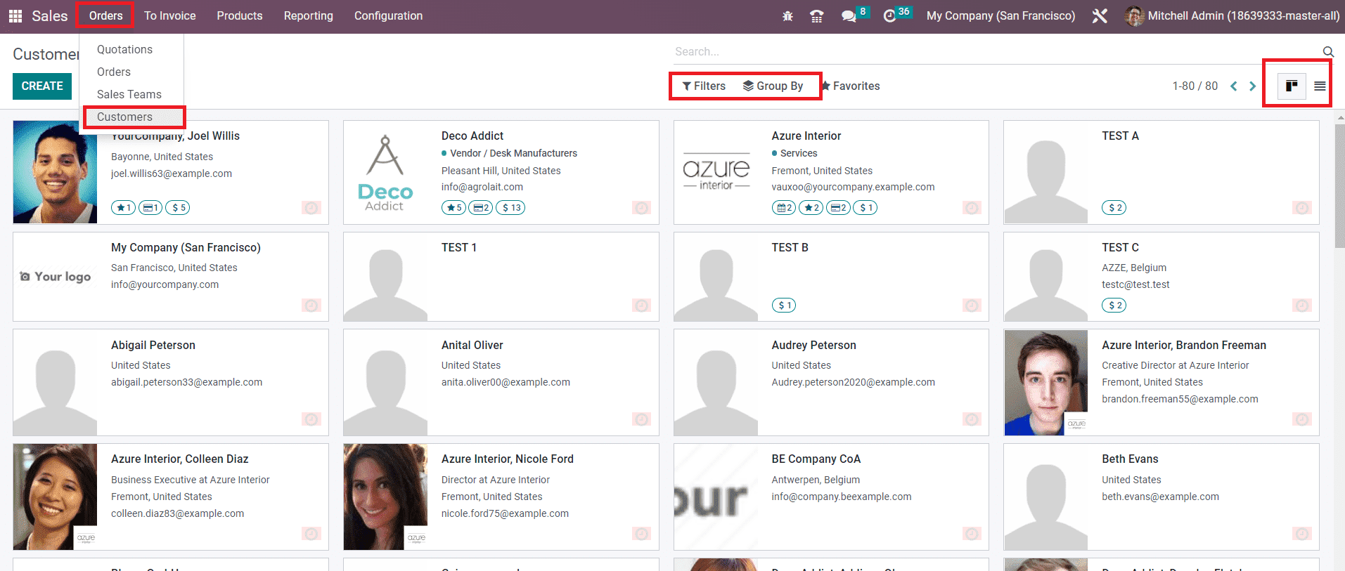 You will get a separate platform in the Odoo Sales module to create and manage the records of the customers of your company. Under the Orders menu, you can find the Customers platform as shown below. The window depicted below is shown in Kanban view which can be converted to a list view also based on your requirements. The customizable Filters and Group By options will assist you in easily locating required data from the record of the customers maintained in your database.