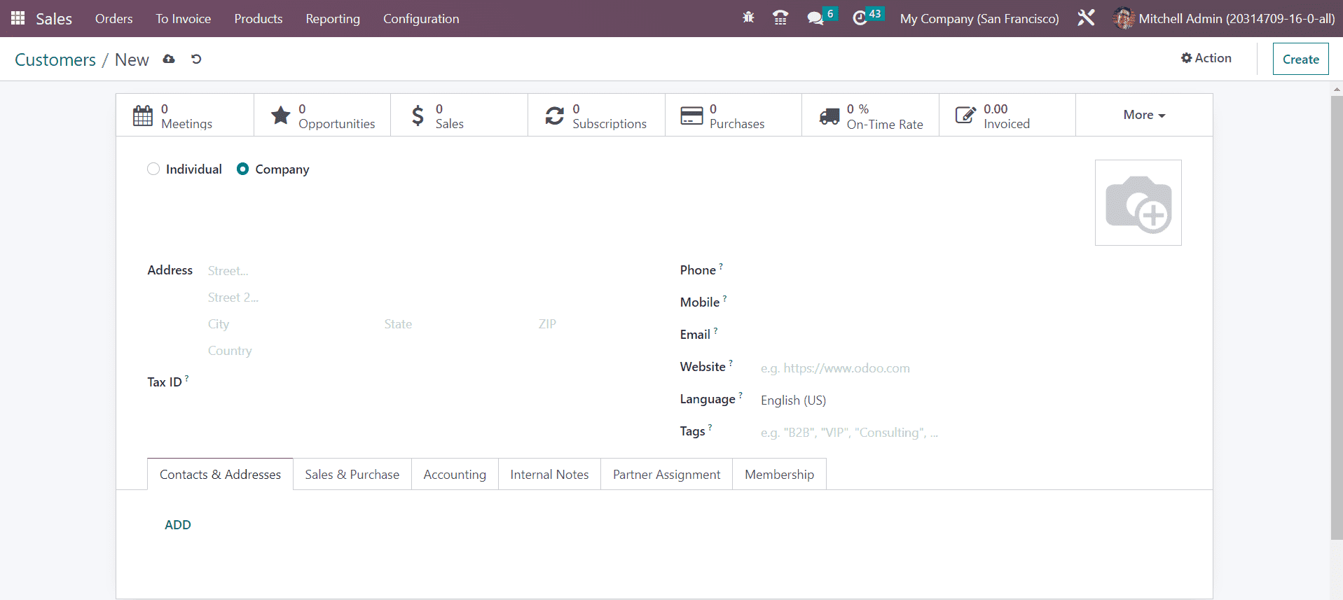 You can configure a new customer profile in the name of an individual or company. The name of the customer can be mentioned in the given space. Then, you can configure the necessary details regarding the customer such as Address, Tax ID, Phone, Mobile, Email, Website, Language, and Tags.