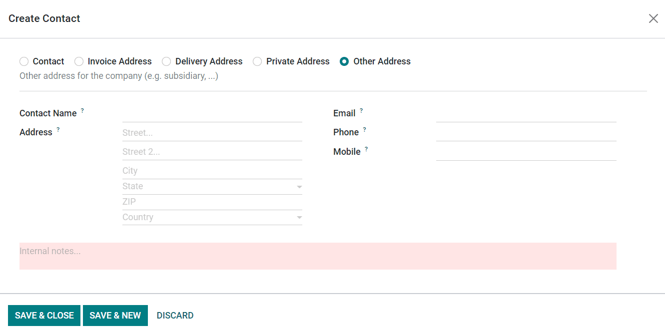 You can mention the contact details as Invoice Address, Delivery Address, Private Address, or Other Address based on the option you select. After selecting the suitable option, you can specify the Contact Name, Address, Email, Phone, and Mobile in the respective fields.