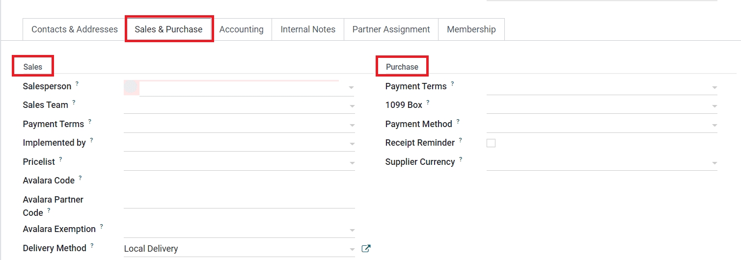 Under the Sales tab, you can assign a Salesperson and Sales Team in the respective fields to manage the sales operations related to this customer. By mentioning Payment Terms, this payment term will be used instead of the default one for sales orders and customer invoices. You can mention the assigned partner id in the Implemented By field. You can define a specific Pricelist for this customer in the specified field which will be used for sales instead of the default one. The customer will get an Avalara Code which can be used to cross-reference in the Avalara port. Mention the Avalara Partner Code and Avalara Exemption in the respective fields. The default delivery method to use in the sales orders of this customer can be specified in the Delivery Method field.