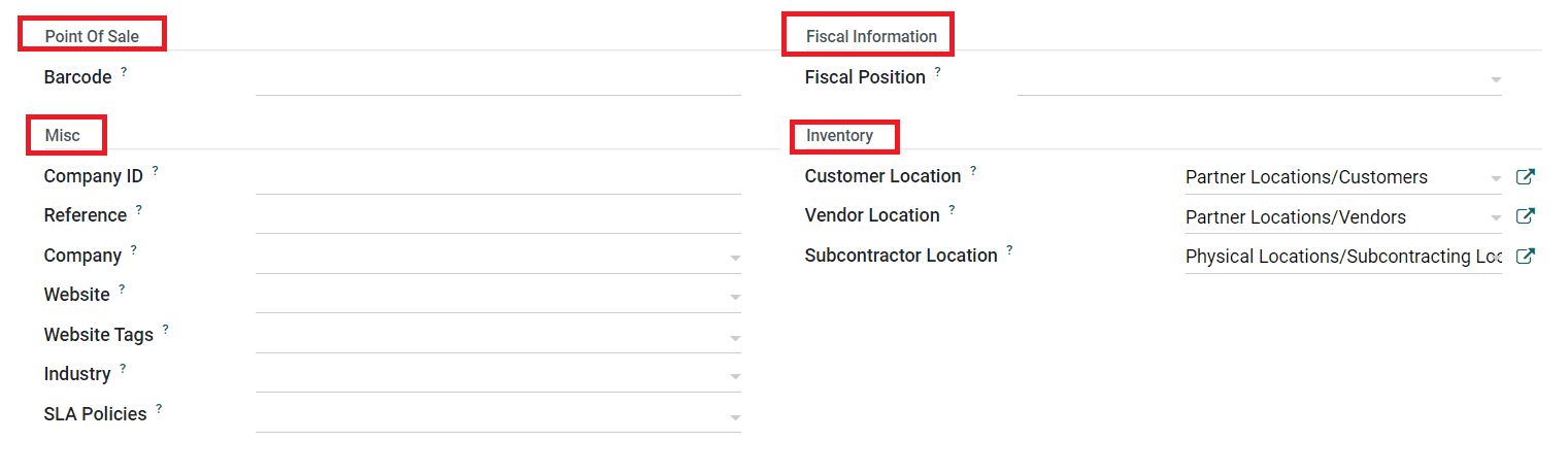 You can set a Barcode for the customer to identify them in Point of Sale. The Fiscal Position of the customer can be defined under the Fiscal Information field. The fiscal position determines the taxes/accounts used for this contact. Under the Miscellaneous tab, you can specify the Company ID, Reference, Company, Website, Website Tags, Industry, and SLA Policies in the corresponding fields.