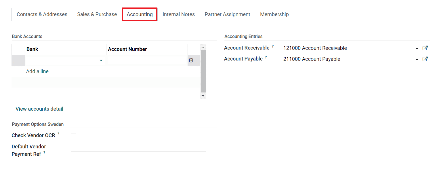 Using the Add a Line button, you can mention the Bank Accounts of the customer one by one along with the Account Number. After adding bank accounts, you can use the View Accounts Details button to get a better view of accounts. The Account Receivable and Account Payable can be specified under the Accounting Entries field.