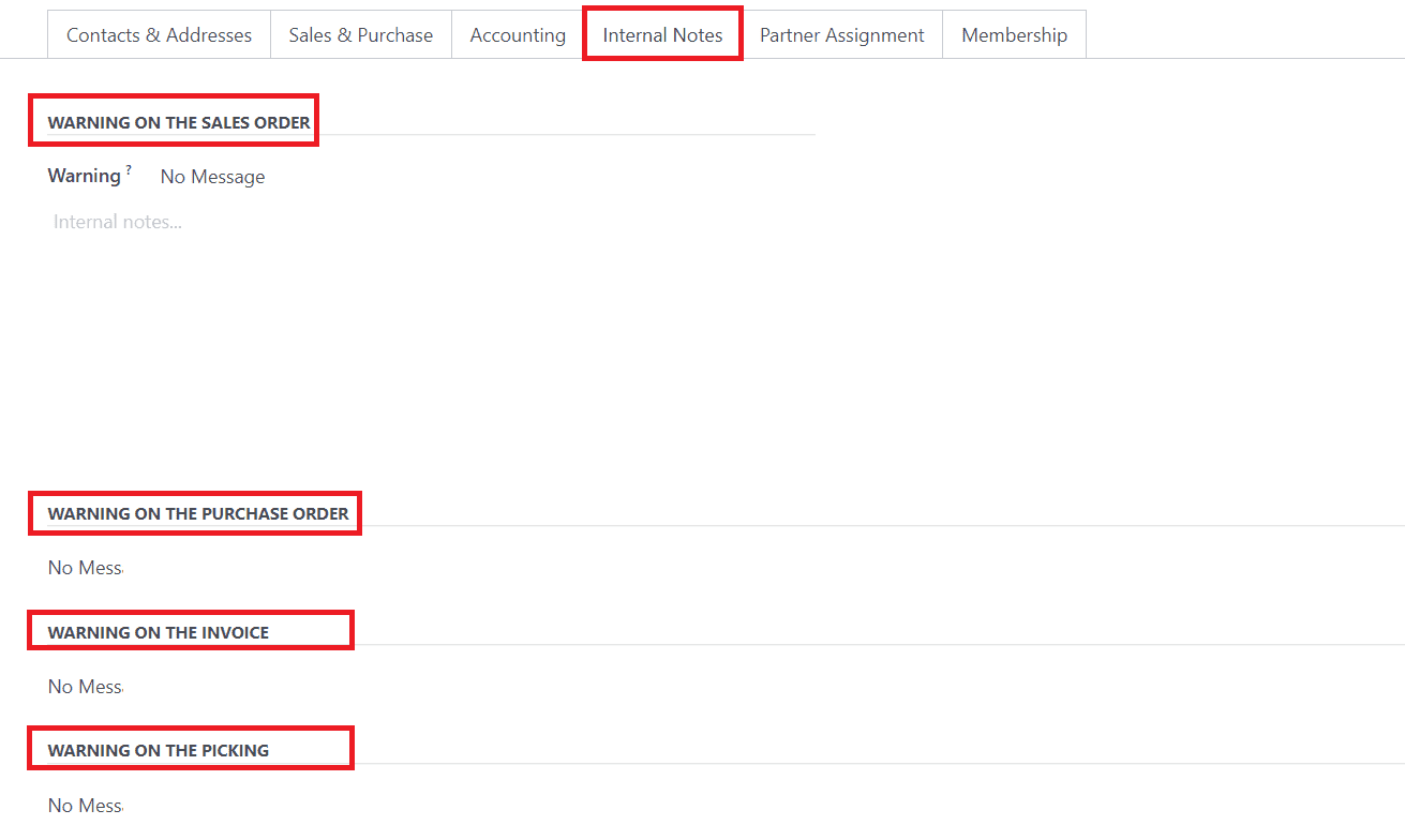 As highlighted in the image above, you can generate warnings on the sales orders, purchase orders, invoices, and picking for this customer.
