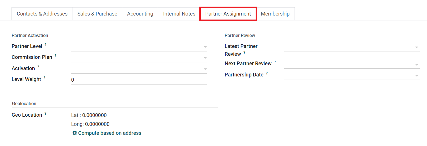 The Partner Assignment tab will assist you in congratulating the Partner Activation, Partner Review, and Geolocation details. Under the Partner Activation field, you can mention the Partner Level, Commission Plan, Activation, and Level Weight. The Partner Review field can be used to specify Latest Partner Review, Next Partner Review, and Partnership Date.