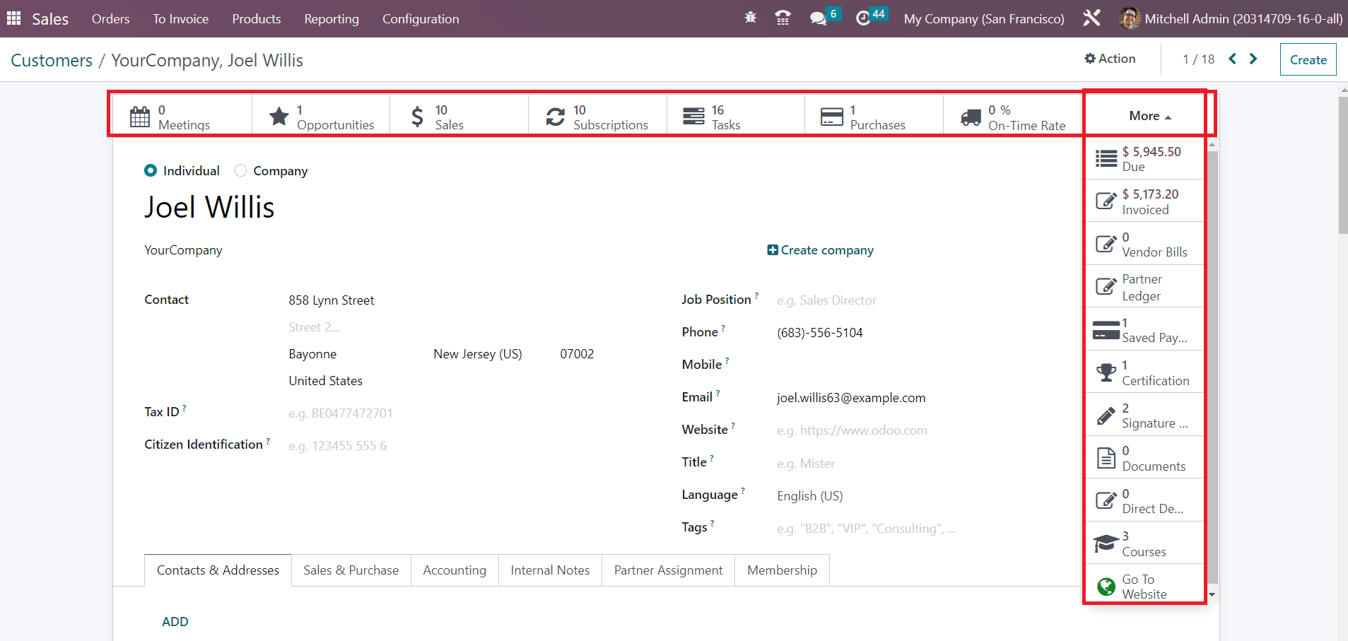 Based on the operations done with the customer, you will get smart buttons on the screen to manage each of those operations. Here, you can find the smart buttons for Meetings, Opportunities, Sales, Subscriptions, Tasks, Purchases, On Time Rate, Due, Invoiced Amount, Vendor Bills, Partner Ledger, Saved Payment Tokens, Certifications, Signature, Documents, Direct Debit Mandates, and Courses details of the customer Joel Willis.