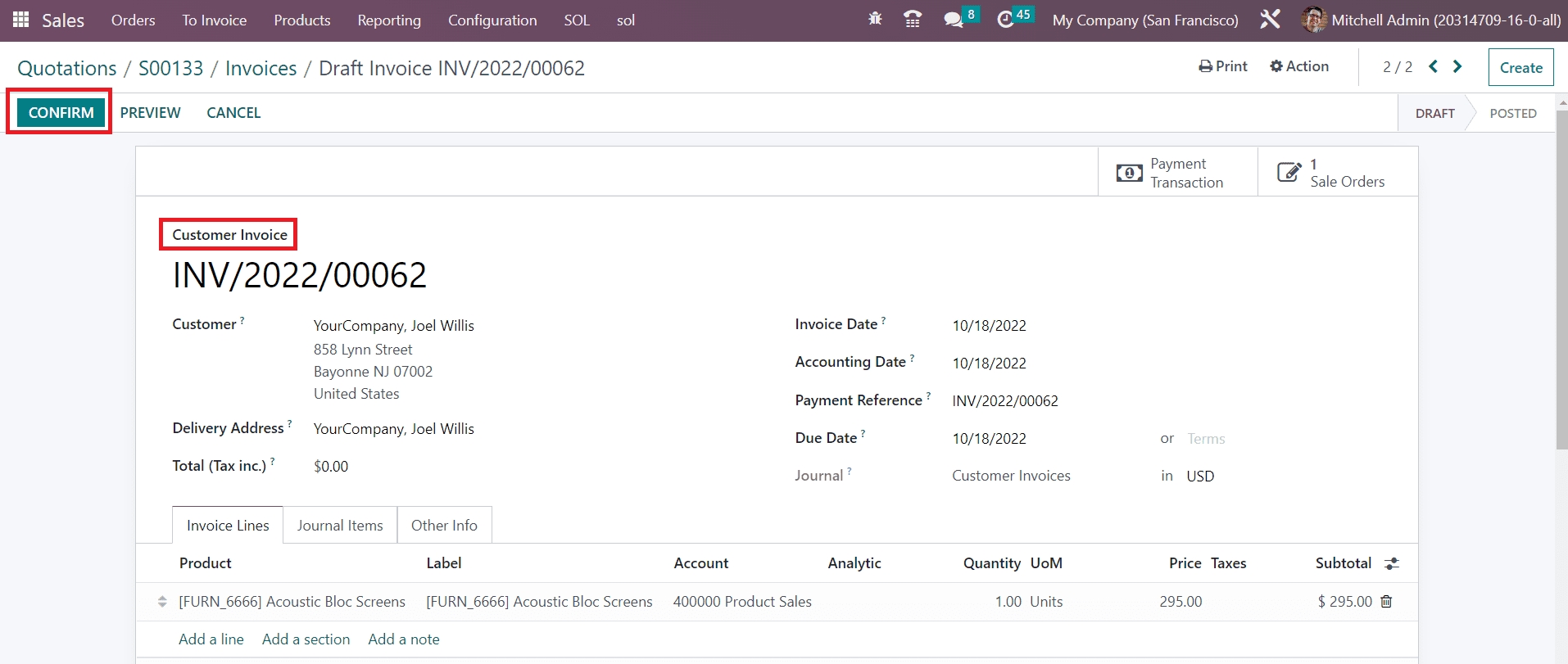 You can select a Regular Invoice, Down Payment (percentage), or Down Payment (fixed amount) based on your company’s invoicing policies. Click on the Create and View Invoice button. Odoo will lead you to a new window that will show the draft form of the invoice.