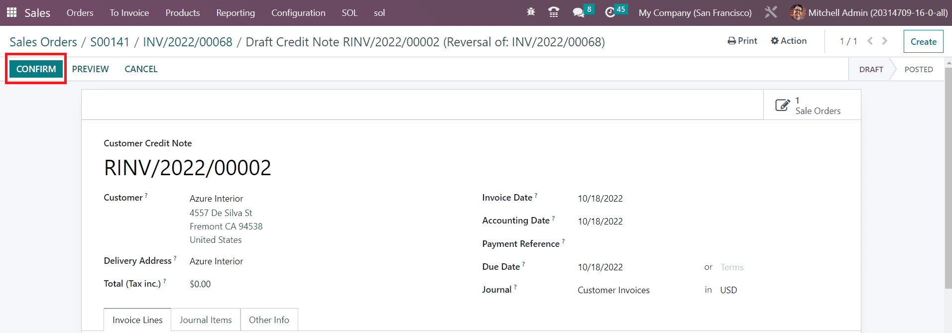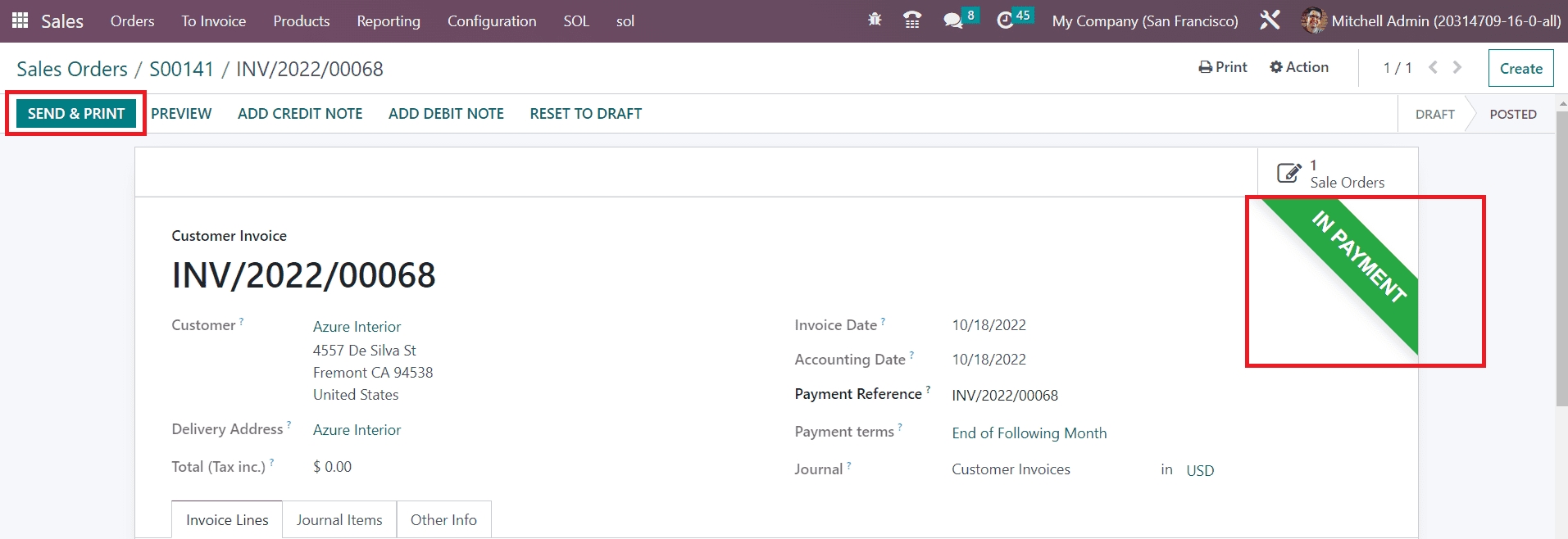 The Send & Print button will help you to send the invoice to the respective customer and take print of it. If you reset the invoice to draft, you can use the Reset to Draft button.