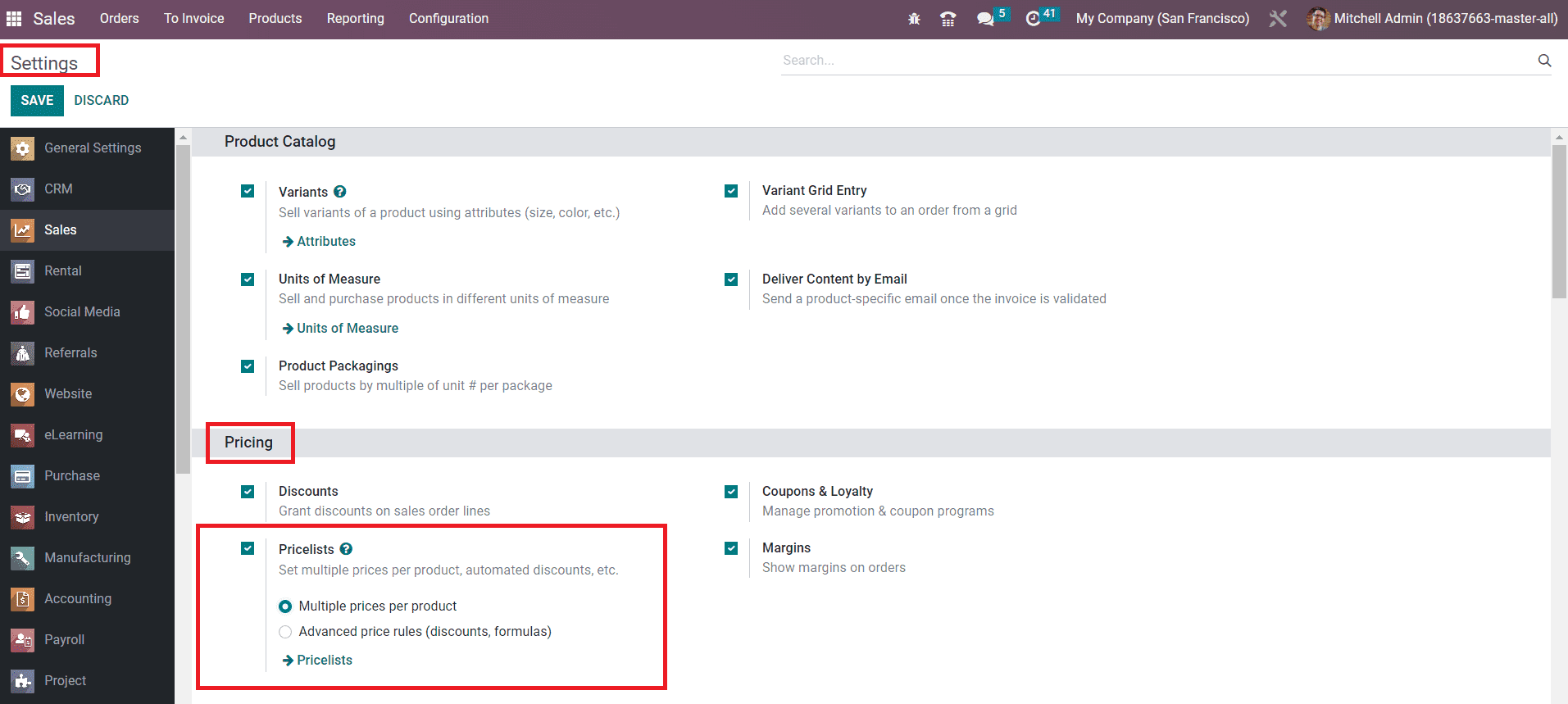 In order to get access to the platform to configure new pricelists, you must activate the corresponding feature from the Settings menu of the Sales module. One can easily activate the Pricelists feature from the Pricing tab as shown in the image below.