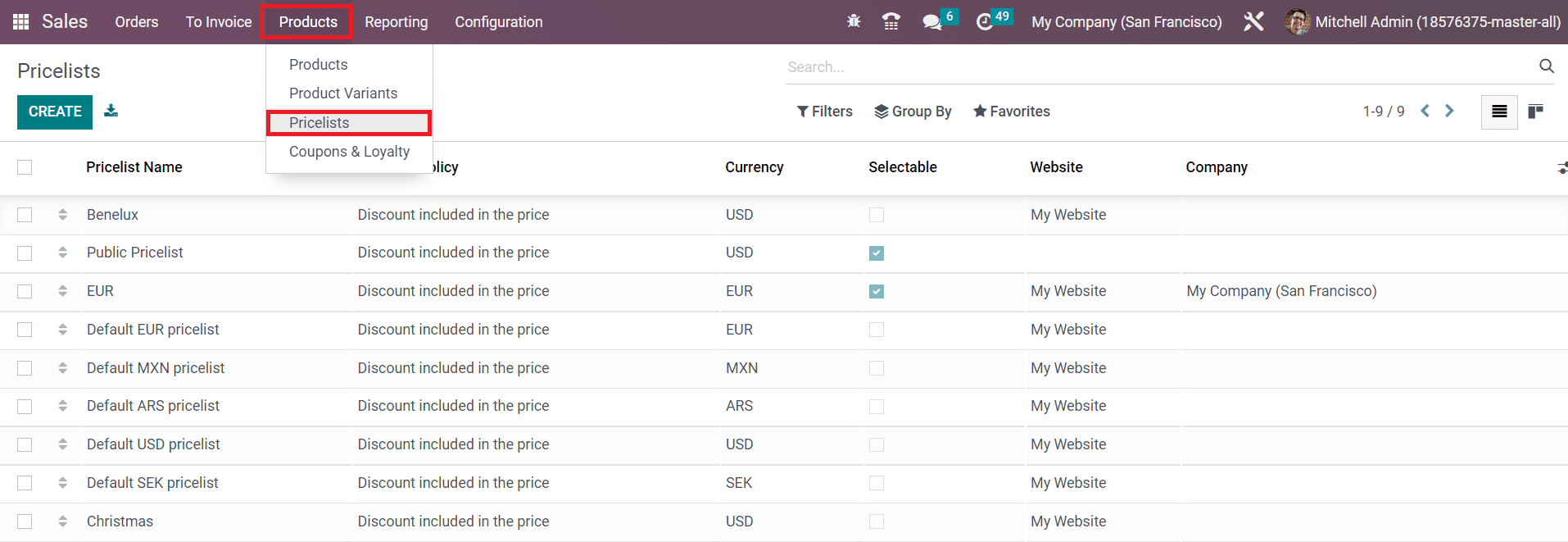 We will detail each of these options in this session. After activating the Pricelist feature, you will be able to find the corresponding option under the Products menu as marked in the screenshot below to get access to the pricelist platform.