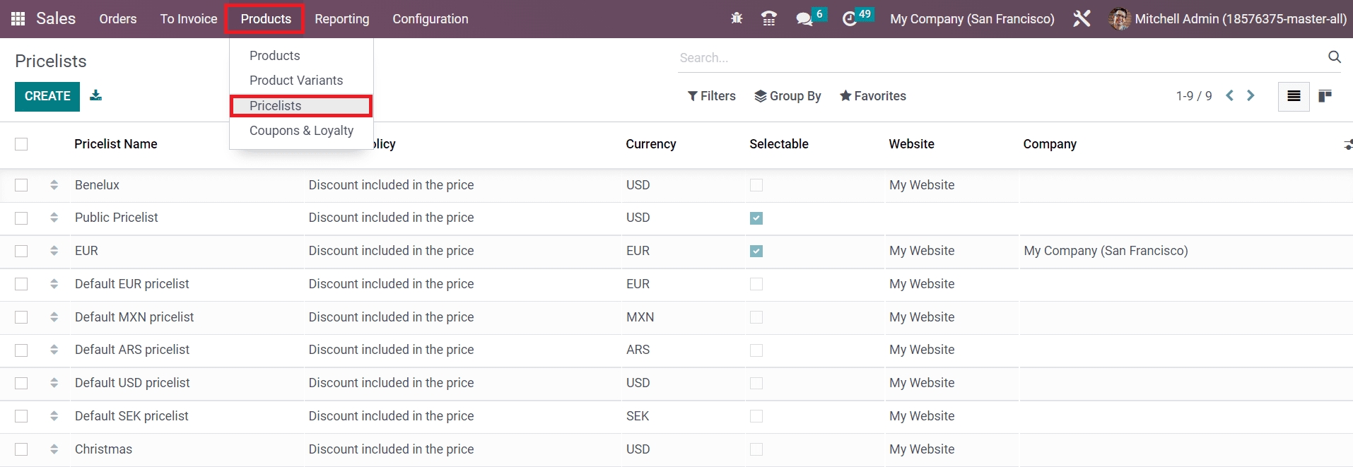 While activating the Pricelist feature from the Settings menu, you can select the Advanced Price Rules option to generate an advanced pricelist for products. Now, go to the Pricelist option given under the Product menu. You will get a view of the Pricelist platform as depicted below.
